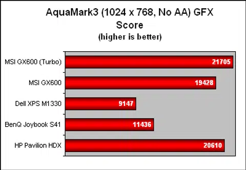 Although we'll be showing all the results for all the notebooks in the table above, from a CPU and system's perspective, the Dell XPS and the HP Pavilion HDX should pose the stiffest challenge to the GX600, as they both have superior processors unless Turbo mode is enabled. Meanwhile, the HP Pavilion HDX and the BenQ Joybook are direct competitors of the GX600 in terms of their graphics chipset, with the Joybook's GeForce 8600M GS slightly inferior to the GT version on the GX600. Finally, with the exception of the Dell notebook, all the other notebooks were using slower 5400RPM hard drives. For evaluation purposes, we installed the relevant drivers from MSI and the GX600 was running Windows Vista Ultimate.