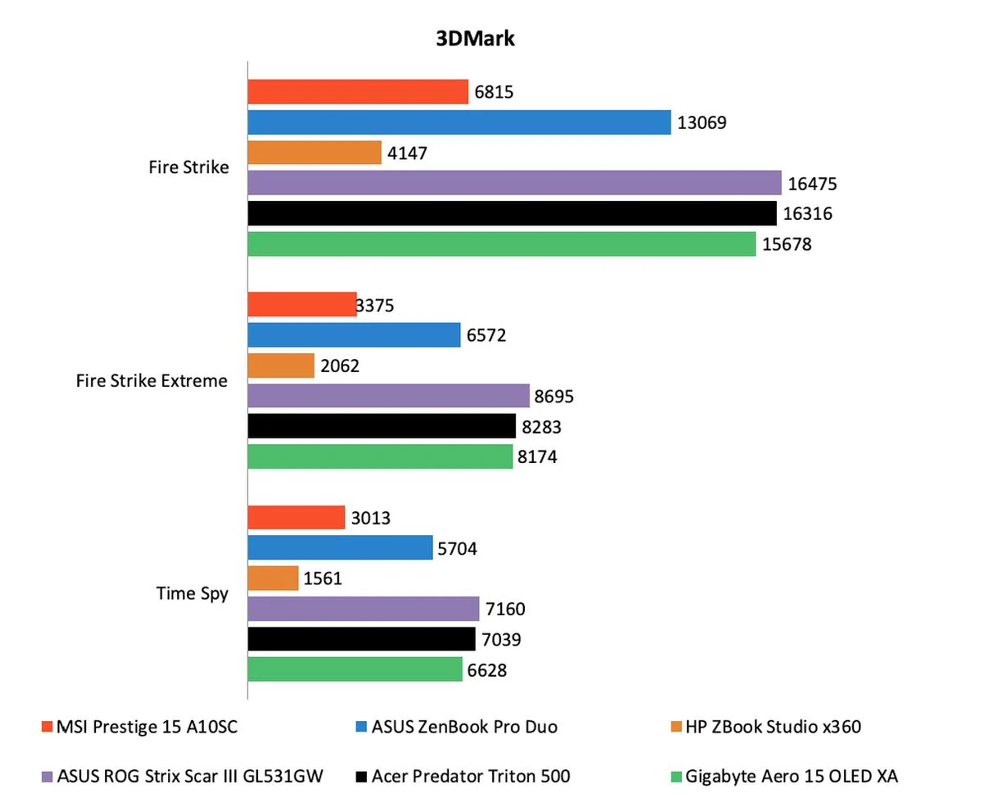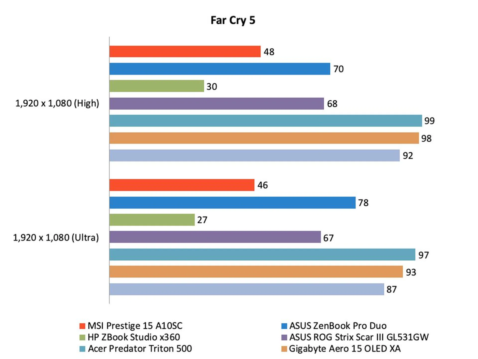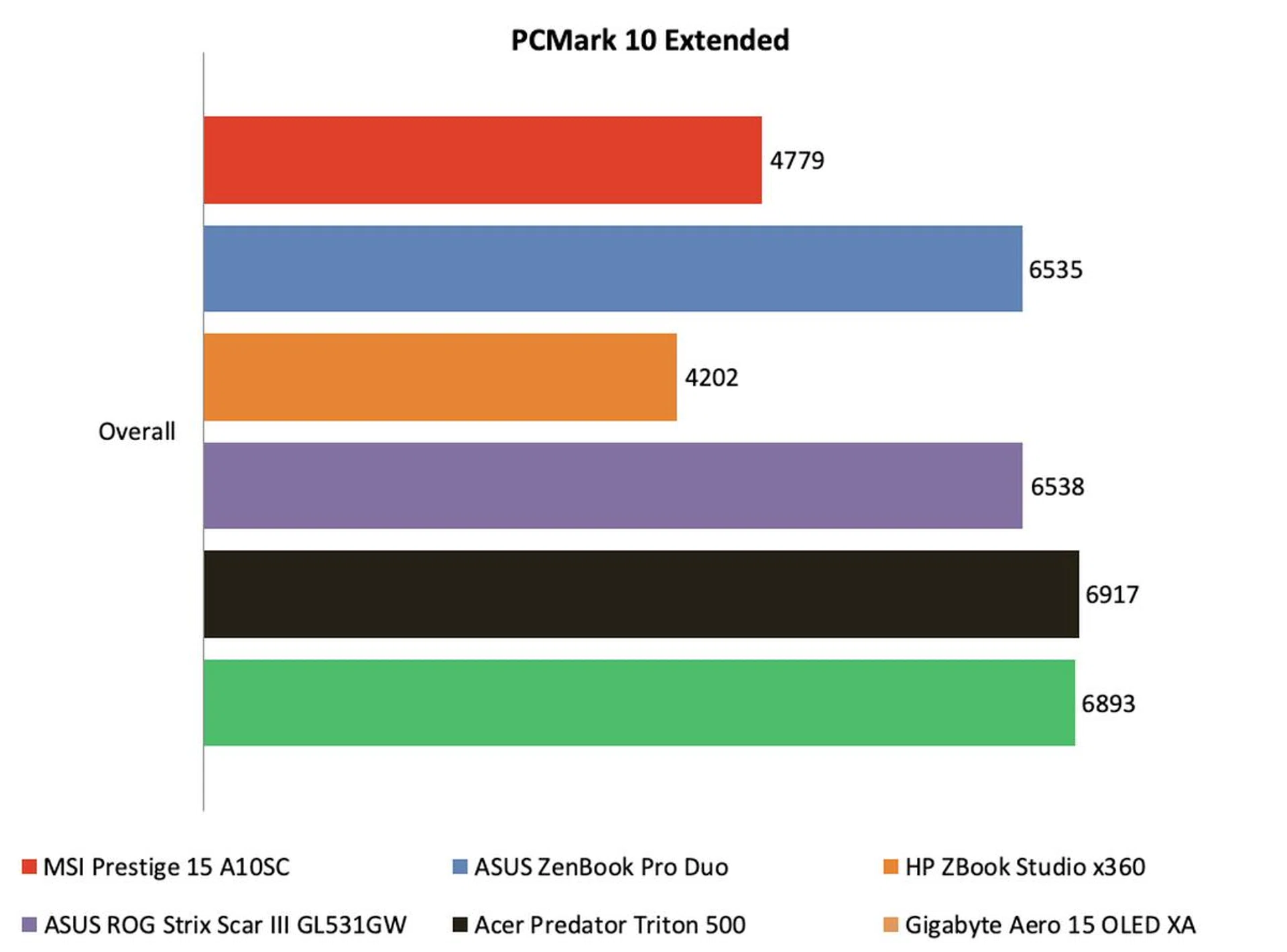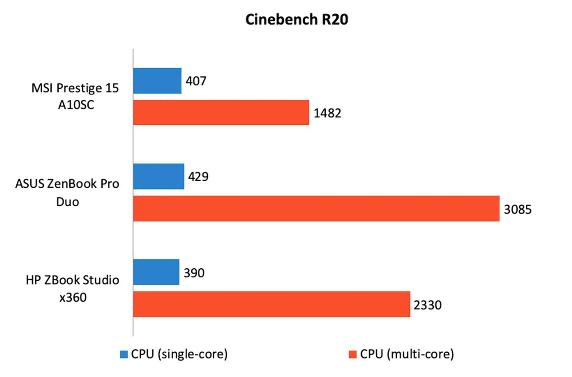 Still, there’s no denying that the notebooks with more powerful 45W CPUs are going to blitz the Prestige 15. On PCMark 10, the other notebooks with 45W CPUs and RTX-class graphics scored about 30% more than the Prestige 15. And on Cinebench R20, the ASUS ZenBook Pro Duo with the mighty Core i9-9980HK processor scored over twice as high on the multi-core workload.
