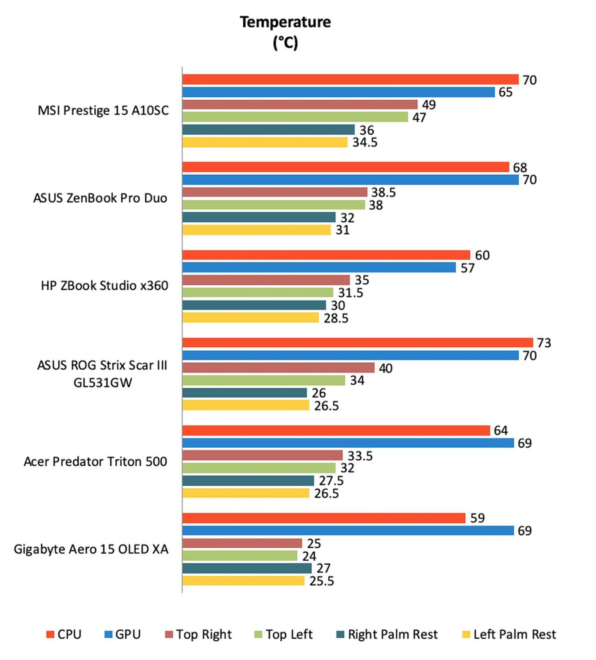 Such hardware in a body that’s just 15.9mm thick is always going to cause heating issues. And the Prestige 15 runs really warm. CPU and GPU temperatures are within the acceptable limit but the body is scorching hot when it’s heavily taxed. The top corners of the keyboard were just a few degrees shy of 50°C and were unbearably hot to touch. It’s also over 10 degrees hotter than the other 15-inch notebooks that we tested. The palm rests were hot too – the warmest amongst all the other 15-inch notebooks. In short, you probably don’t want to be doing anything too intensive if you are using this notebook on your lap.