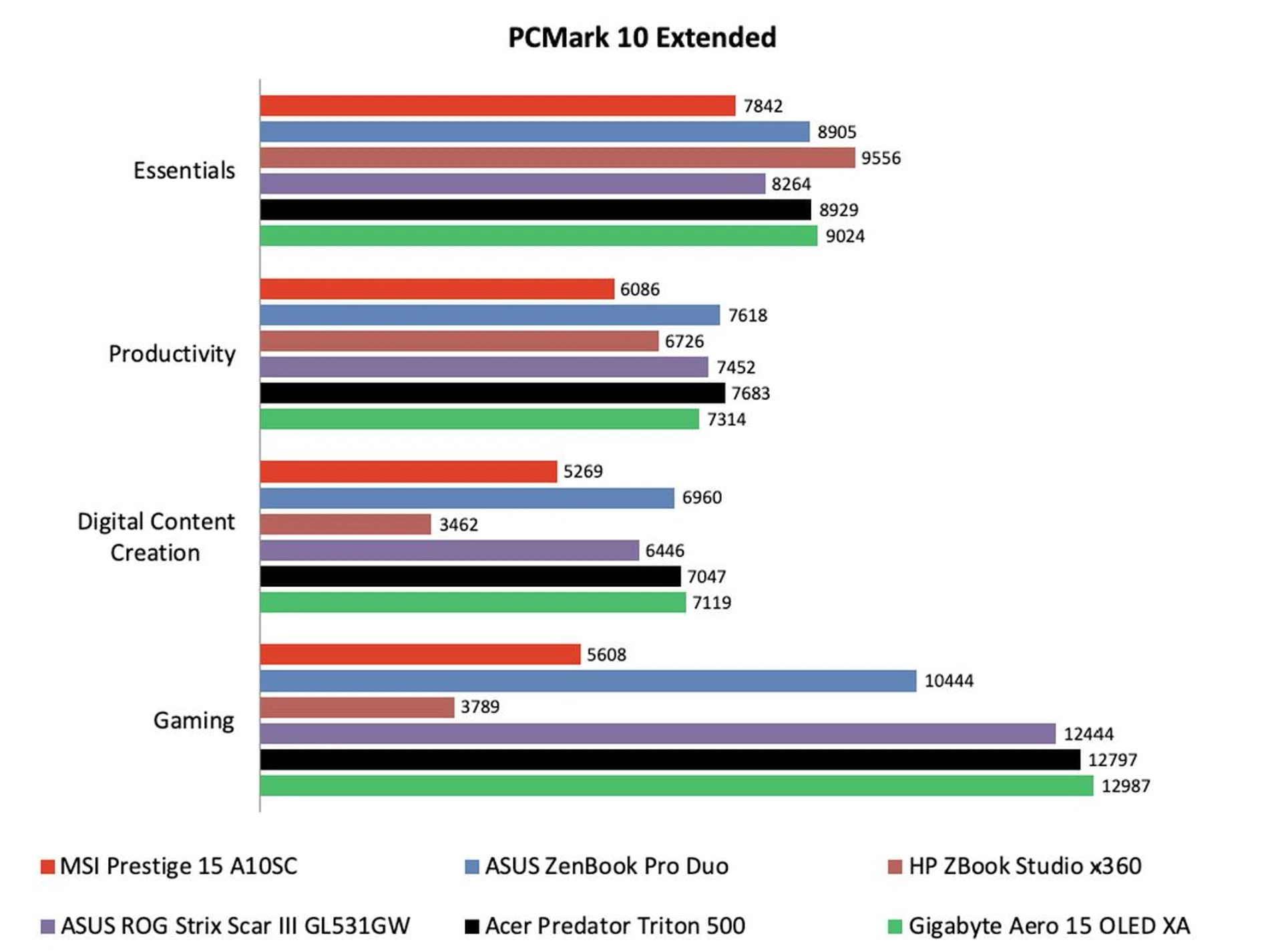 General computing performance was decent. It may look down on numbers compared to the other notebooks here but note that the other 15-inch notebooks have much more powerful processors. Even though the Prestige 15 has a Core i7-10710U processor with 6 cores, you have to remember that it’s maximum rated TDP is just 25W. In comparison, the other notebooks all have processors that have maximum rated TDPs of 45W. That’s a huge difference. If you look at other notebooks with similar medium-power processors, you’ll find that the Prestige 15’s numbers are much more comparable.