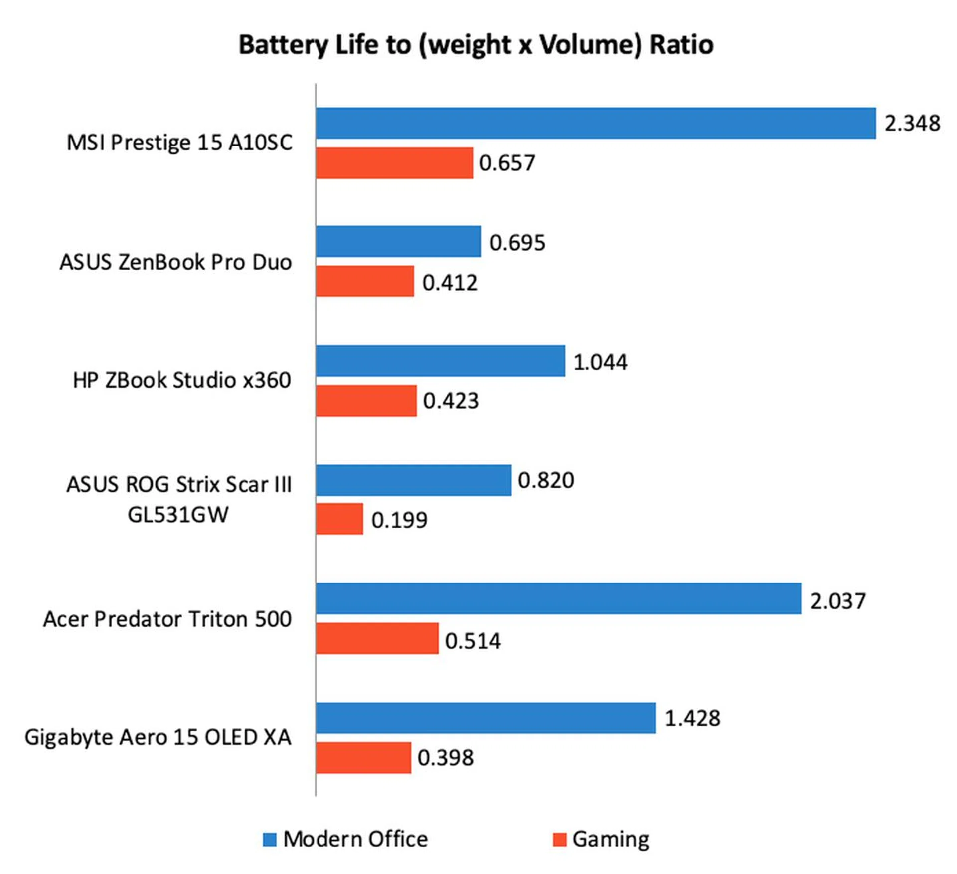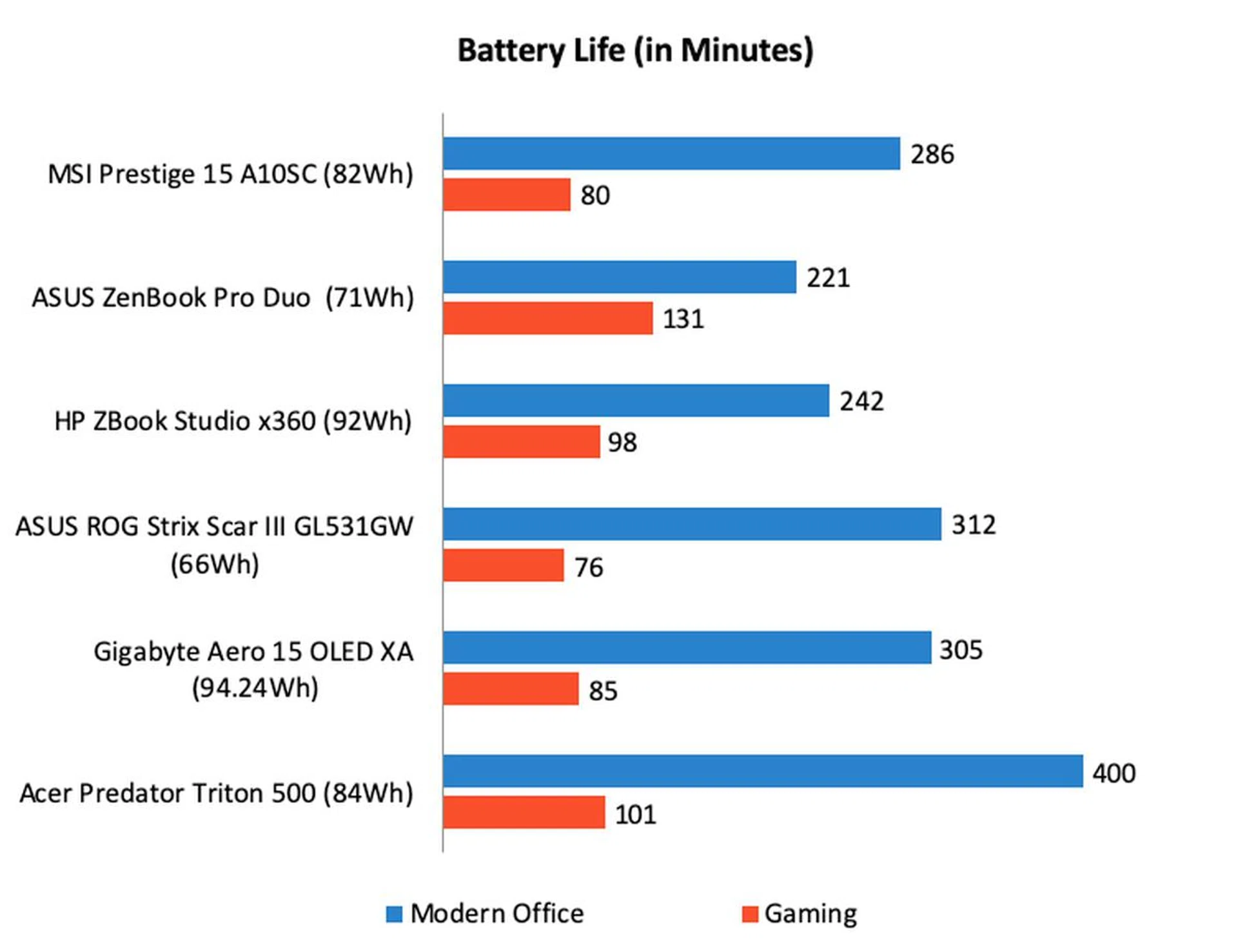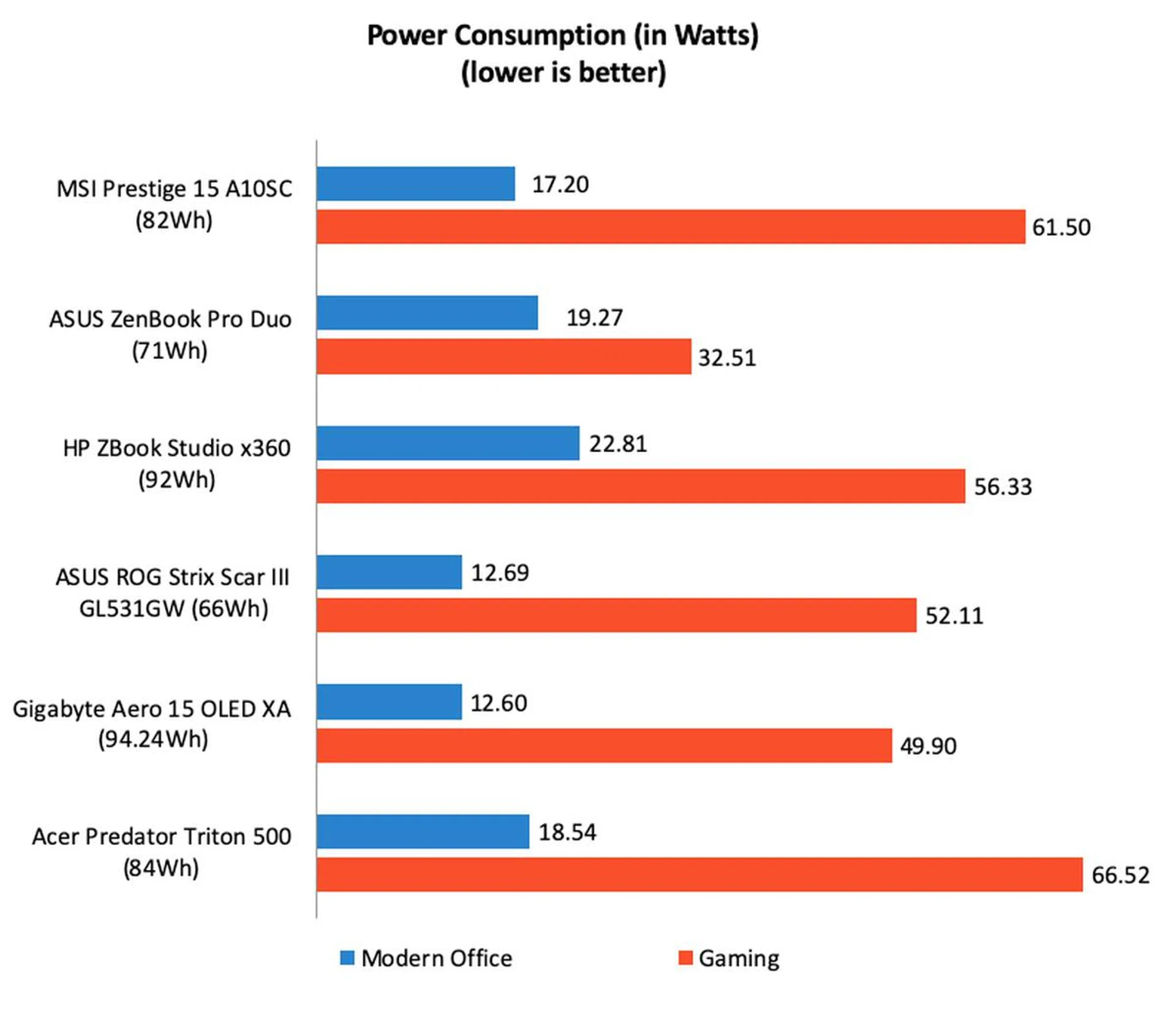 Battery life is commendable for a notebook with a 15-inch 4K display at 286 minutes or just 14 minutes shy of 5 whole hours. The only other notebooks here with 4K 15-inch displays are the ASUS ZenBook Pro Duo and Gigabyte Aero 15 OLED. Power consumption is a little on the high side but that’s forgivable given its bright 4K display. Thanks to its slim dimensions, its portability score was way ahead of the pack especially if you take into account its battery life on the Modern Office workload. It still managed the best score on the Gaming workload but because of its high power consumption, its lead wasn’t as impressive.