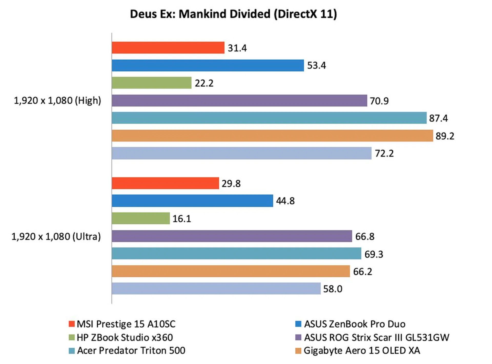 Graphics performance was also in line with our expectations, although, once again, it was no match for the other notebooks. Bear in mind that the other notebooks are powered by considerably more powerful RTX-class GPUs. To give you an idea of the difference in compute power, the GeForce GTX 1650 Max-Q is capable of 2.55 TFLOPs of compute power whereas the GeForce RTX 2060 is capable of 4.608 TFLOPs of compute power. In games, notebooks with RTX-class graphics were at least 50% faster than the Prestige. Nevertheless, the Prestige 15 is sufficient for accelerating compatible apps and also powerful enough to play games (as long as you turn the settings down). Interesting, the Prestige 15 showed little signs of performance throttling – an issue that usually plagues thin notebooks.
