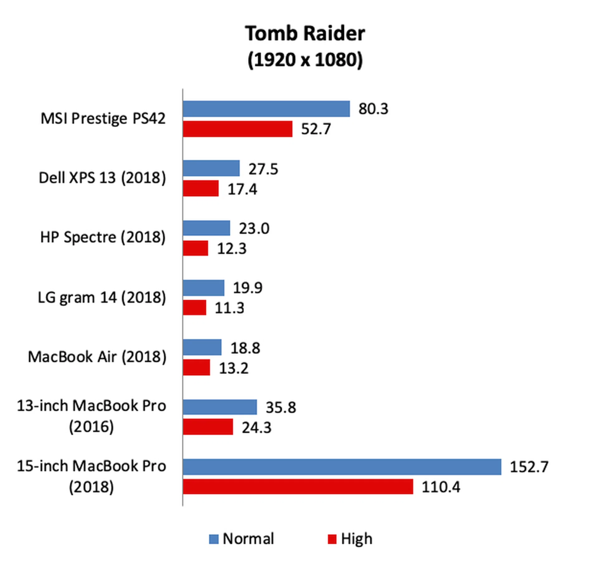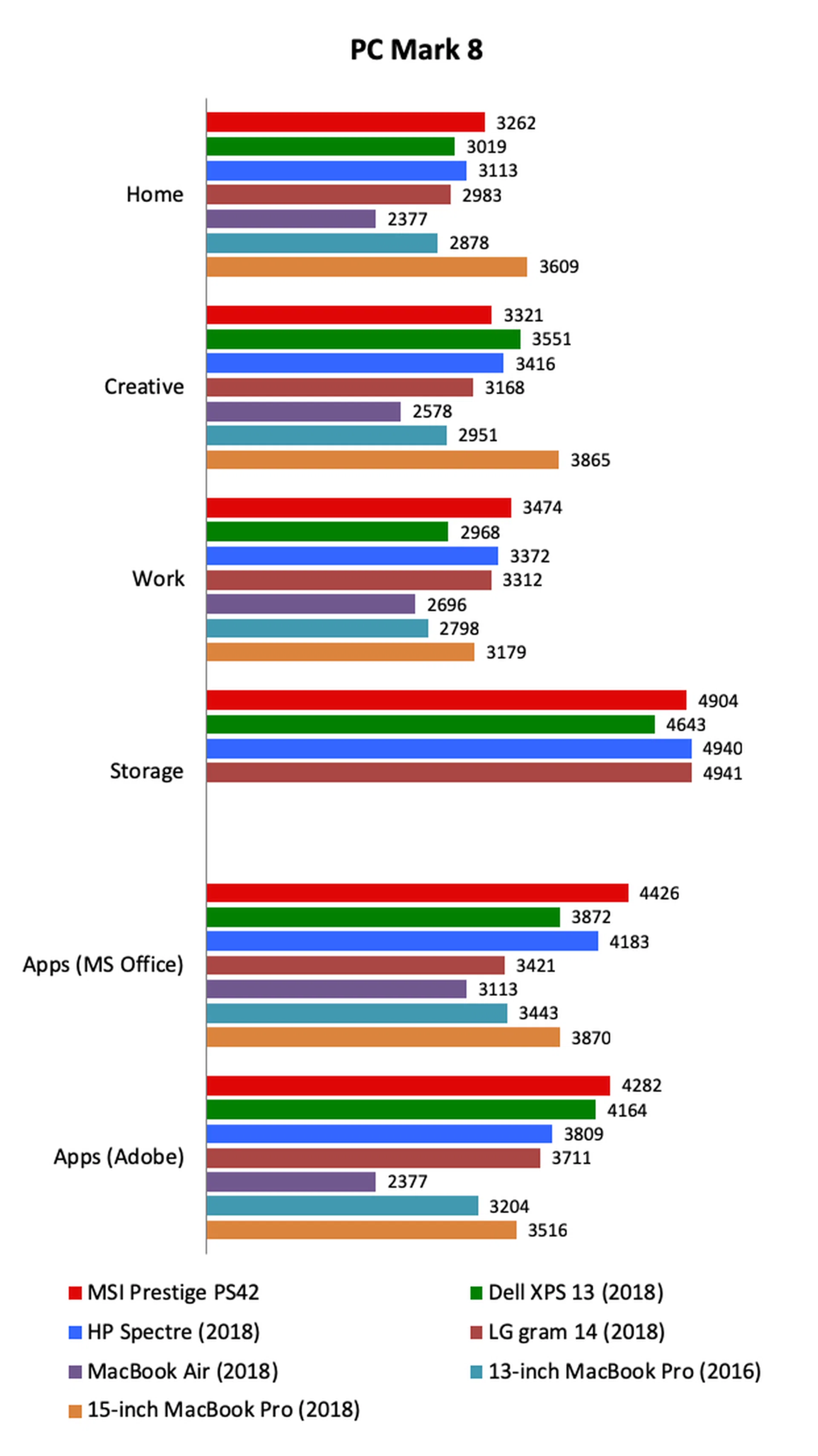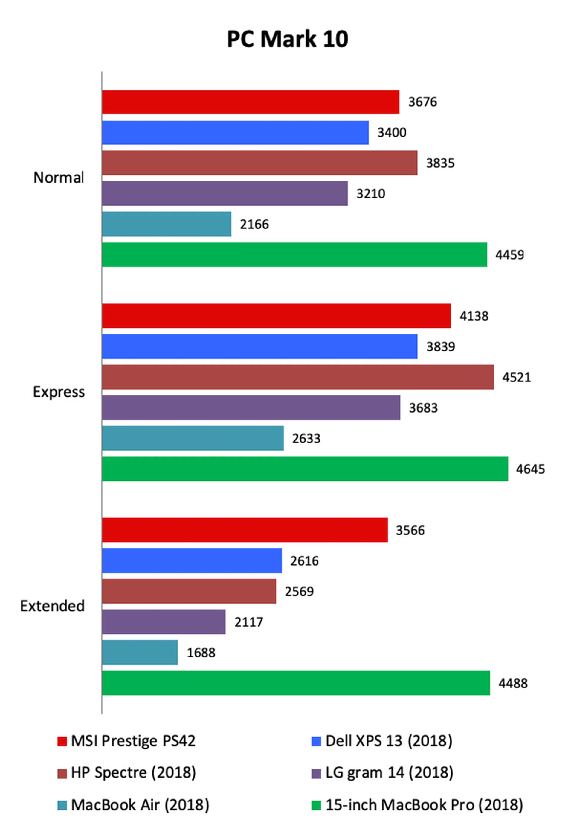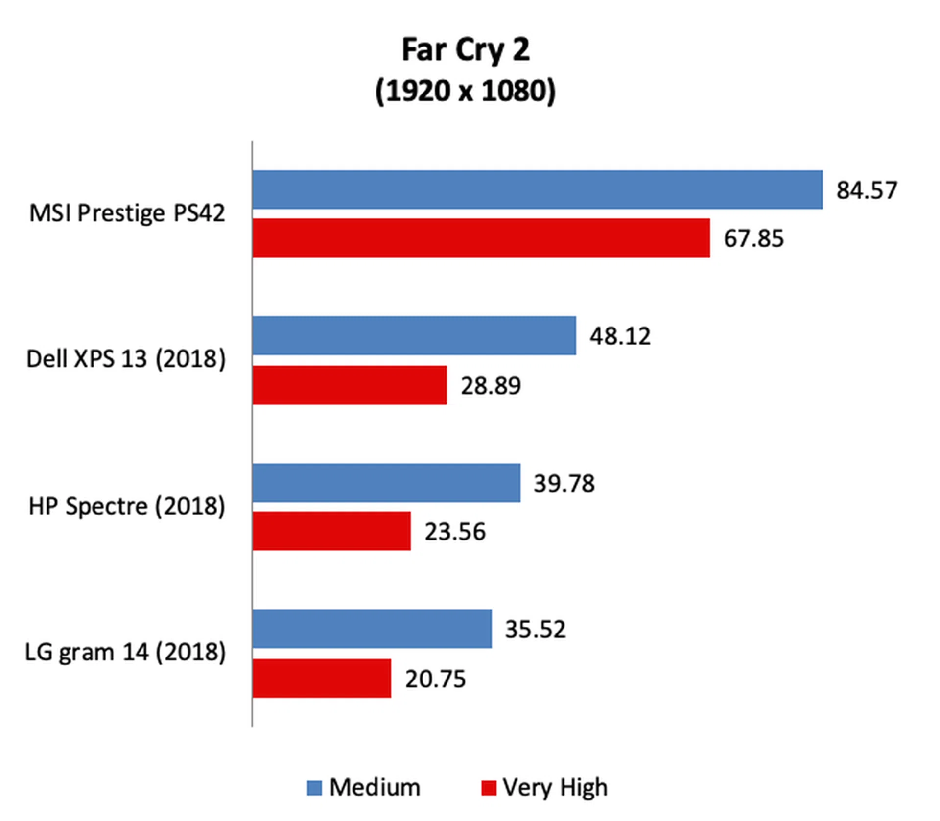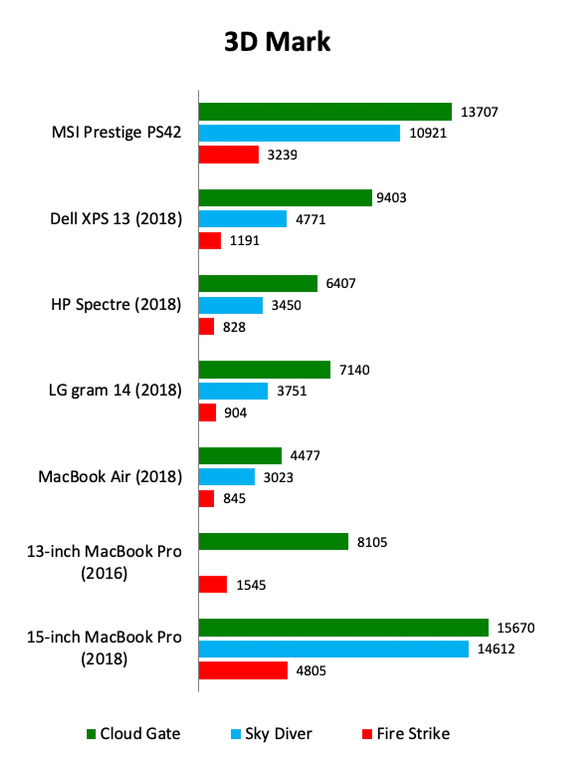 Here they are, pay attention to the Prestige PS42’s advantage over its rivals who are powered by Intel’s integrated GPU. The difference is startling and clearly demonstrates the NVIDIA GeForce MX150’s superiority over Intel’s integrated graphics solutions.
