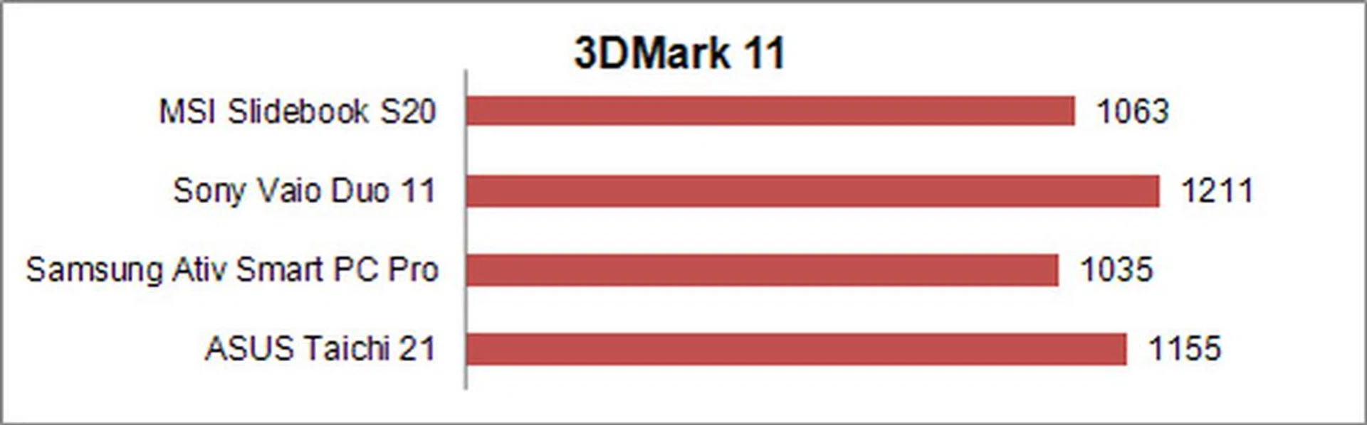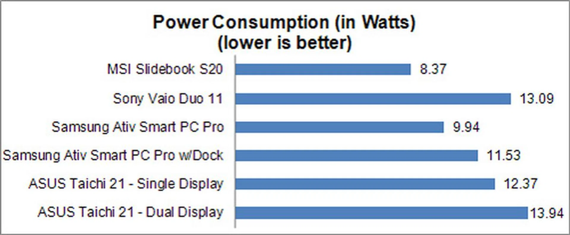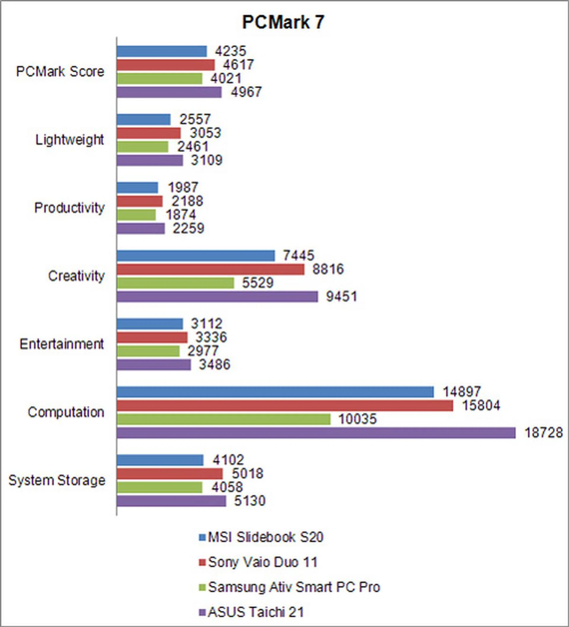 Out of this entire line-up, the Samsung ATIV Smart PC Pro had the best battery life, with or without its dock. However, the MSI Slidebook S20 almost ties with it with a battery life of 4 hours and 11 minutes - just a few minutes short of what the Samsung machine achieved with its dock. It's also more than an hour longer than what the Sony and the ASUS mahcines are capable of achieving. This difference is again attributed to the difference in platform components which the ASUS and Sony convertible Ultrabooks used a more power hungry processor and thus raked in similar higher power consumption numbers.