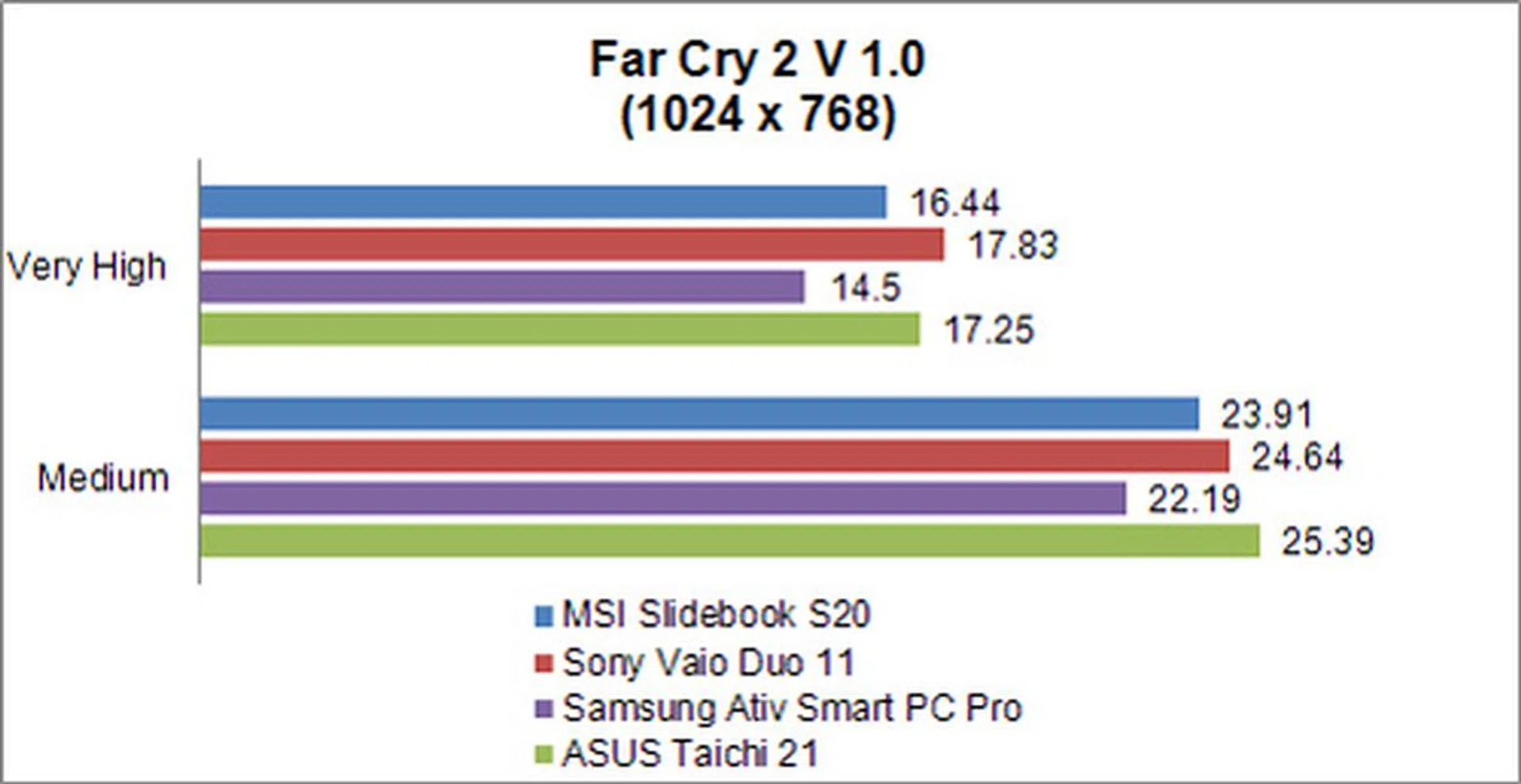 To better translate how the 3DMark numbers churned above relate to most readers, we ran an old but popular title like Far Cry 2 to gauge how these anorexic Ultrabooks are able to handle real world games. We stuck with this old benchmark since their GPUs aren't capable of tackling more intensive titles. Overall, the MSI Slidebook S20's results here mirror that of its 3DMark 11 standing, which is to be expected.