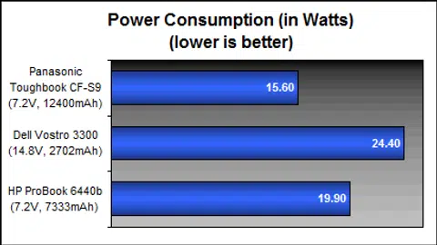 If you aren’t familiar with our testing procedures, our DVD battery test is a simple one where we put turn off all wireless features, then set brightness and volume to 50% while looping a DVD movie till the notebook conks out. Amazingly, the CF-S9 lasted pretty long at 343 minutes, or 5 hours 43 minutes. That’s definitely more than enough time to be do anything without recharging the battery.