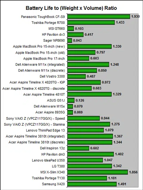Our Portability Index is basically a ratio that's derived with the notebook's uptime divided by the product of the unit's weight and volume. The resulting ratio, where the higher the figure, the more portable a notebook is. As can be seen from our graphs, the combination of its light weight, delightful battery life and decent dimensions make this notebook eminently portable; in fact almost bordering the figures of a netbook, but is much more powerful in terms of performance.