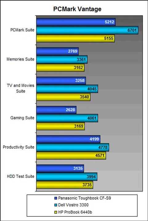Against a similar specced HP ProBook 6440b, the CF-S9 does pretty well here. The Dell Vostro comes packed with a discrete graphics chip and a 7200RPM HDD, so it's no surprise to find the notebook scoring much better. That said, the CF-S9 doesn't disappoint and is pretty much what you expect for its internal configuration. Also note that we're skipping 3DMark06 testing since the unit we're testing uses Intel's integrated graphics, and you aren't going to be gaming on this device anyway.