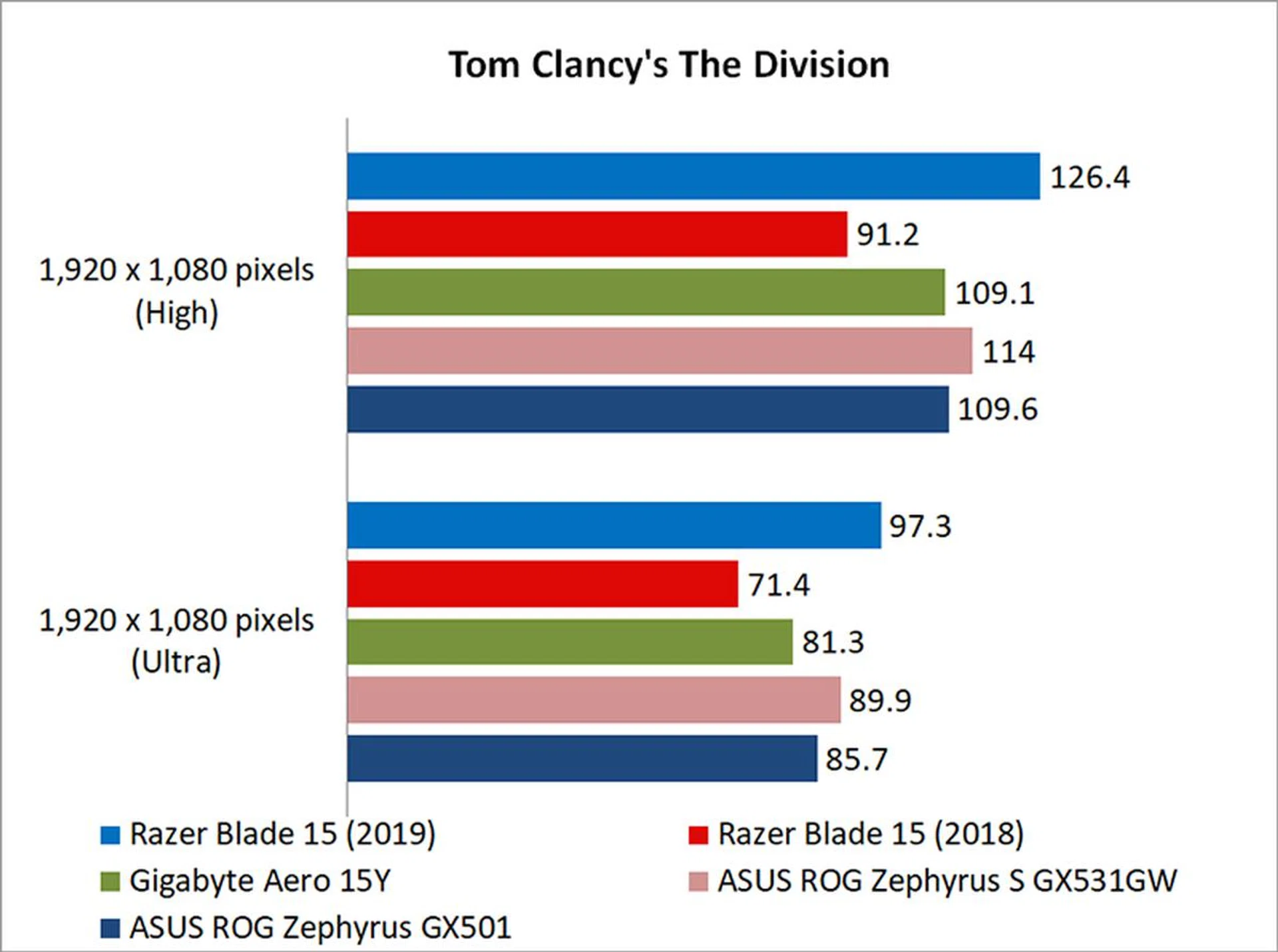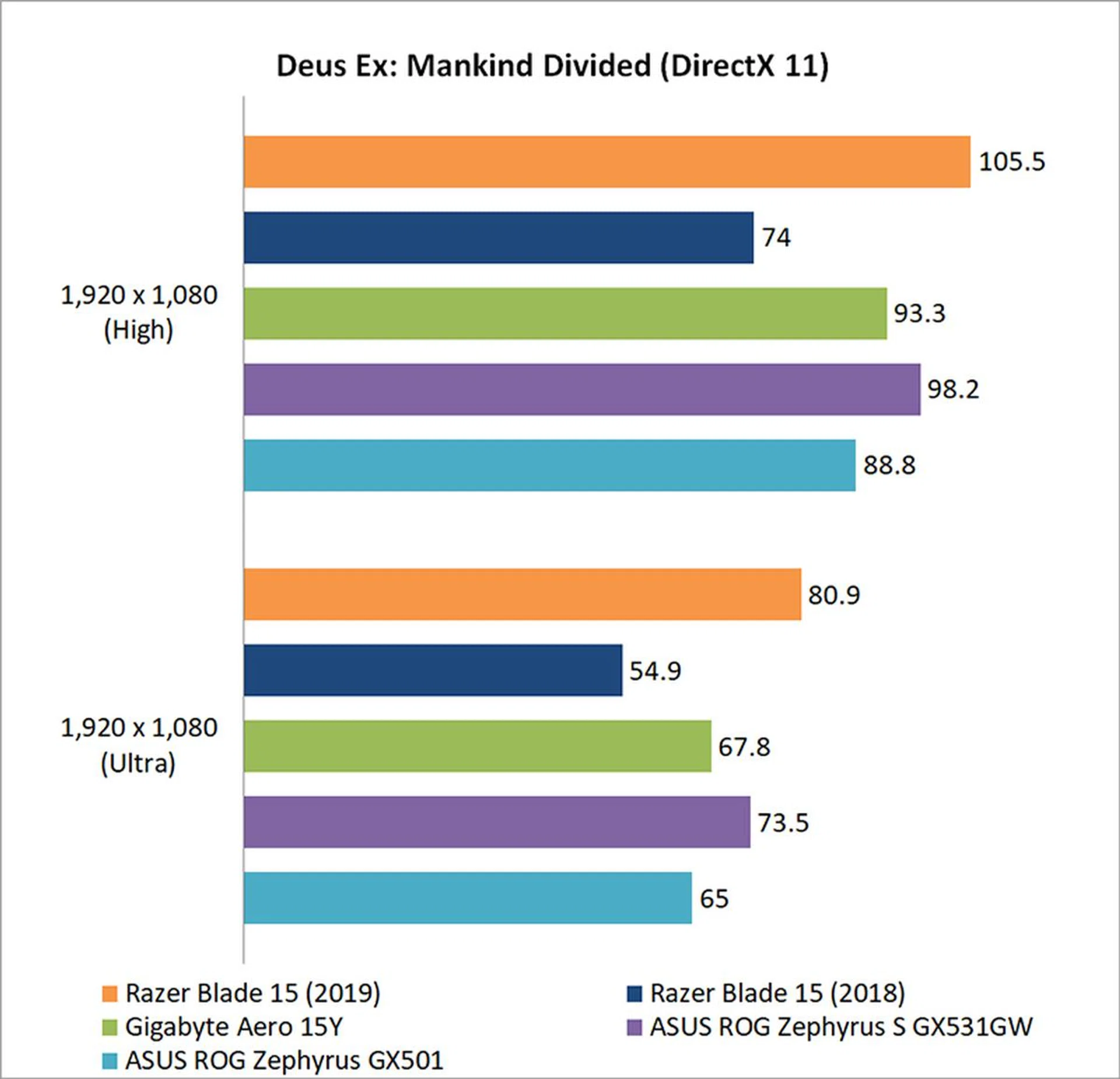 That aside, most folks aren't looking to run VR games on their laptops, and the good news is the Blade 15 performs admirably in actual games. It had no problems running both The Division and Deus Ex: Mankind Divided at Ultra settings and 1080p, although maximizing the 144Hz refresh rate is quite another matter altogether. Compared to the ASUS ROG Zephyrus S GX531GW and its GeForce GTX 2070 Max-Q, the new Razer Blade 15 is just under 10 per cent faster.