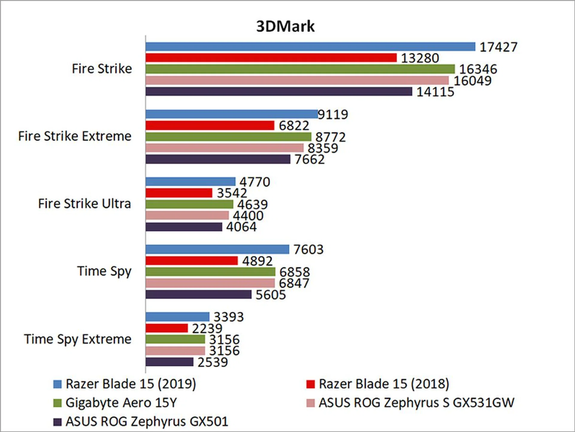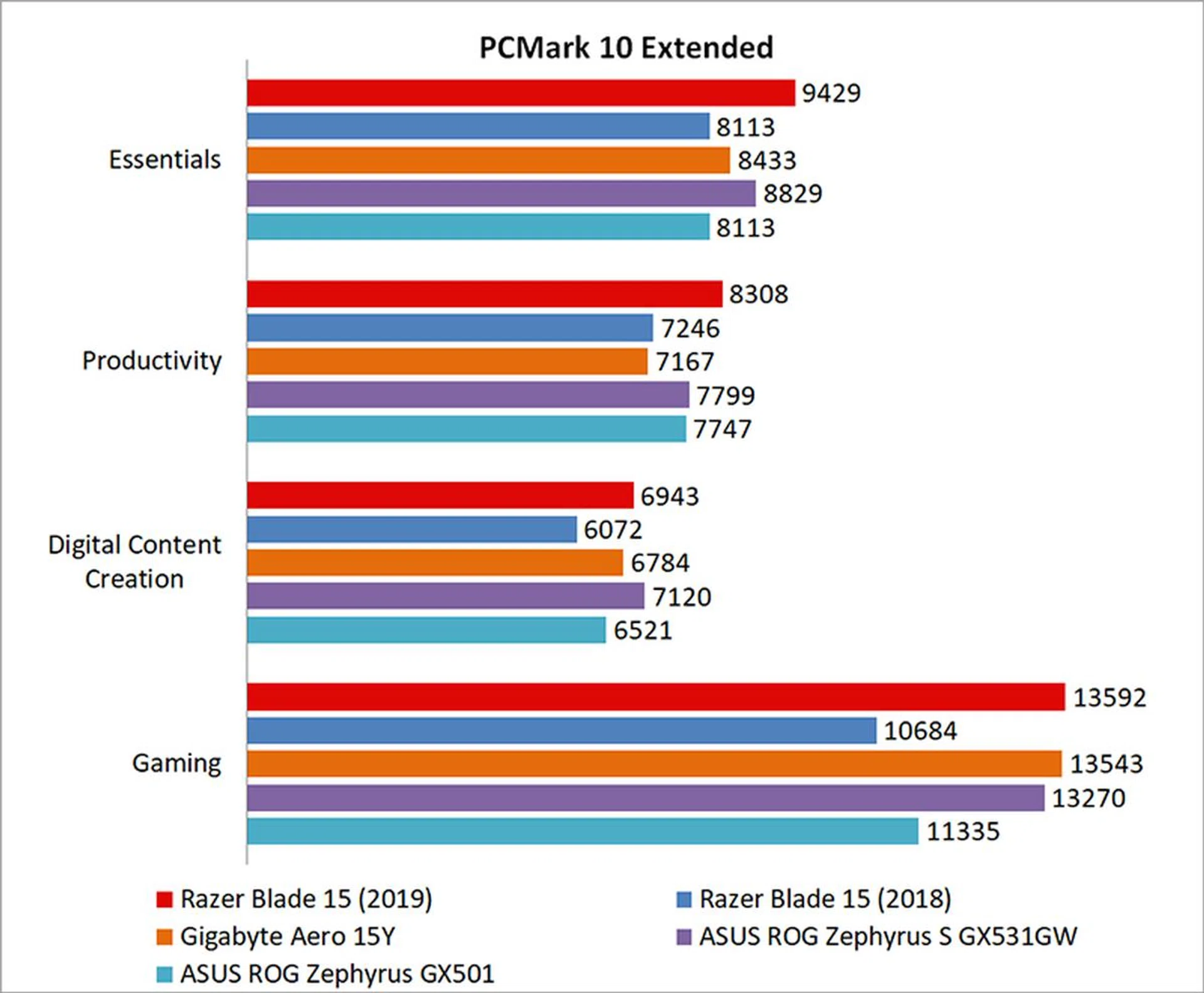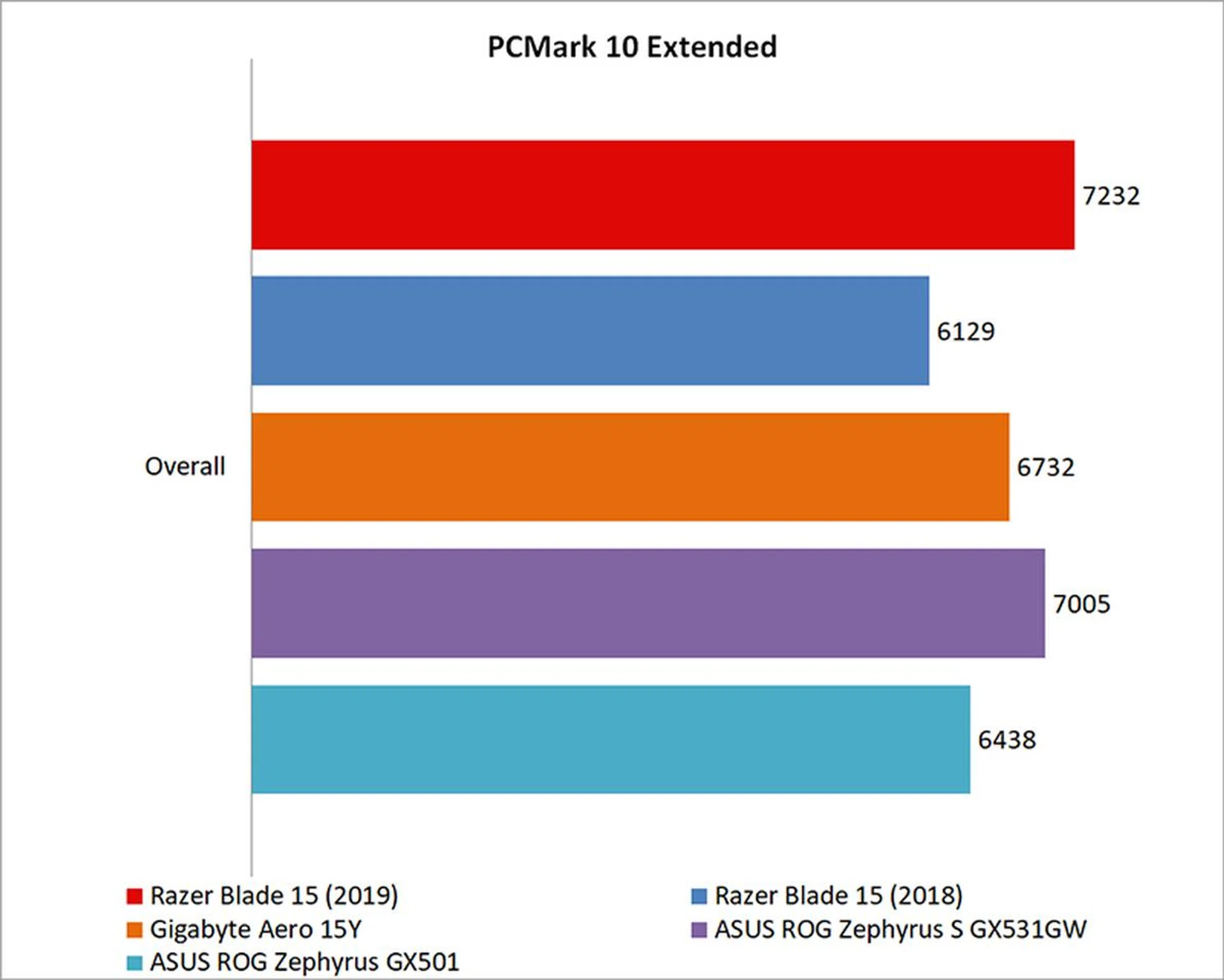 The Razer Blade 15 (2019) did really well in PCMark 10 Extended, topping the charts in terms of overall scores. On the one hand, that's not particularly surprising, since none of the other laptops – with the exception of the Gigabyte Aero 15Y – have a GPU that can match the power of the NVIDIA GeForce RTX 2080 Max-Q. But speaking of the Gigabyte notebook, it only serves to highlight how much thermal design matters and how fast the Razer Blade 15 is. Despite also being equipped with a GeForce RTX 2080 Max-Q and a more powerful overclockable Intel Core i7-8950HK processor, the Aero 15Y was unable to keep up with Razer's laptop.