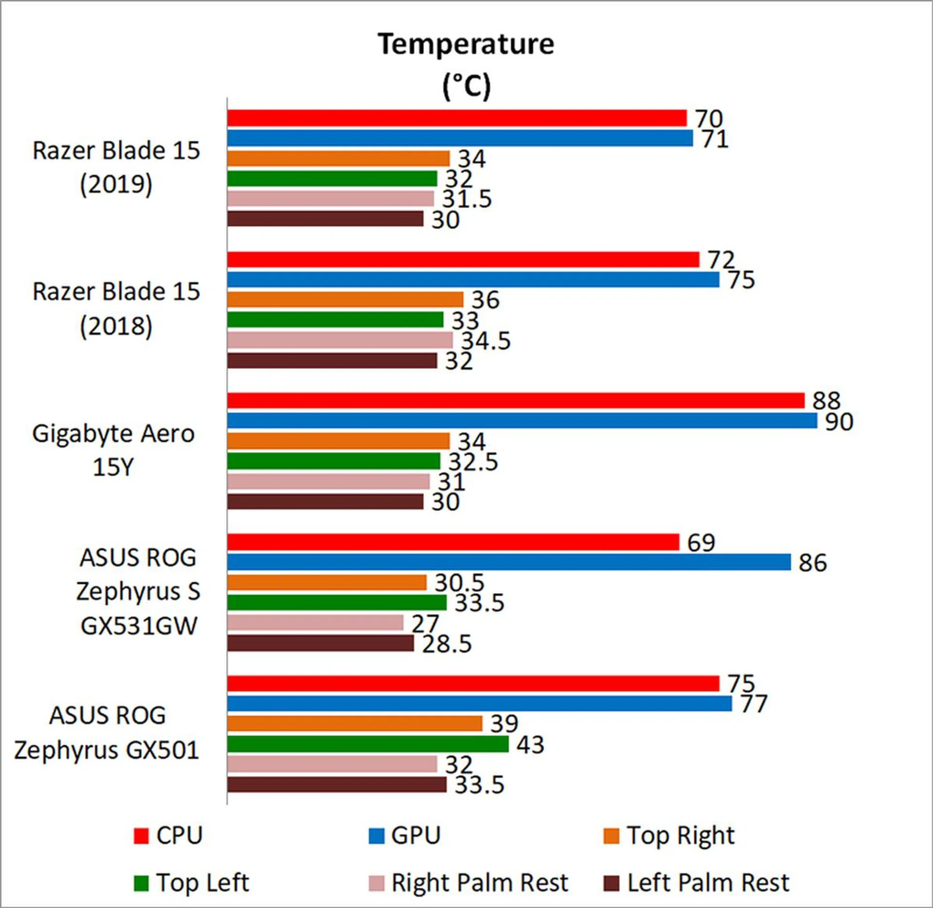 Temperature is always a chief concern with any slim and light gaming notebook, and the Blade 15 is no exception. Surface temperatures are slightly lower compared to its predecessor, as are the CPU and GPU temperatures. That said, that still doesn't mean that the new Blade 15 is a chilly beast, and it still gets noticeably warm during intense gaming sessions. However, at the very least, it seldom gets too hot to touch, and the heat doesn't seem to extend to the keyboard or the WASD keys, an important point if you're going to be gaming for hours on end.