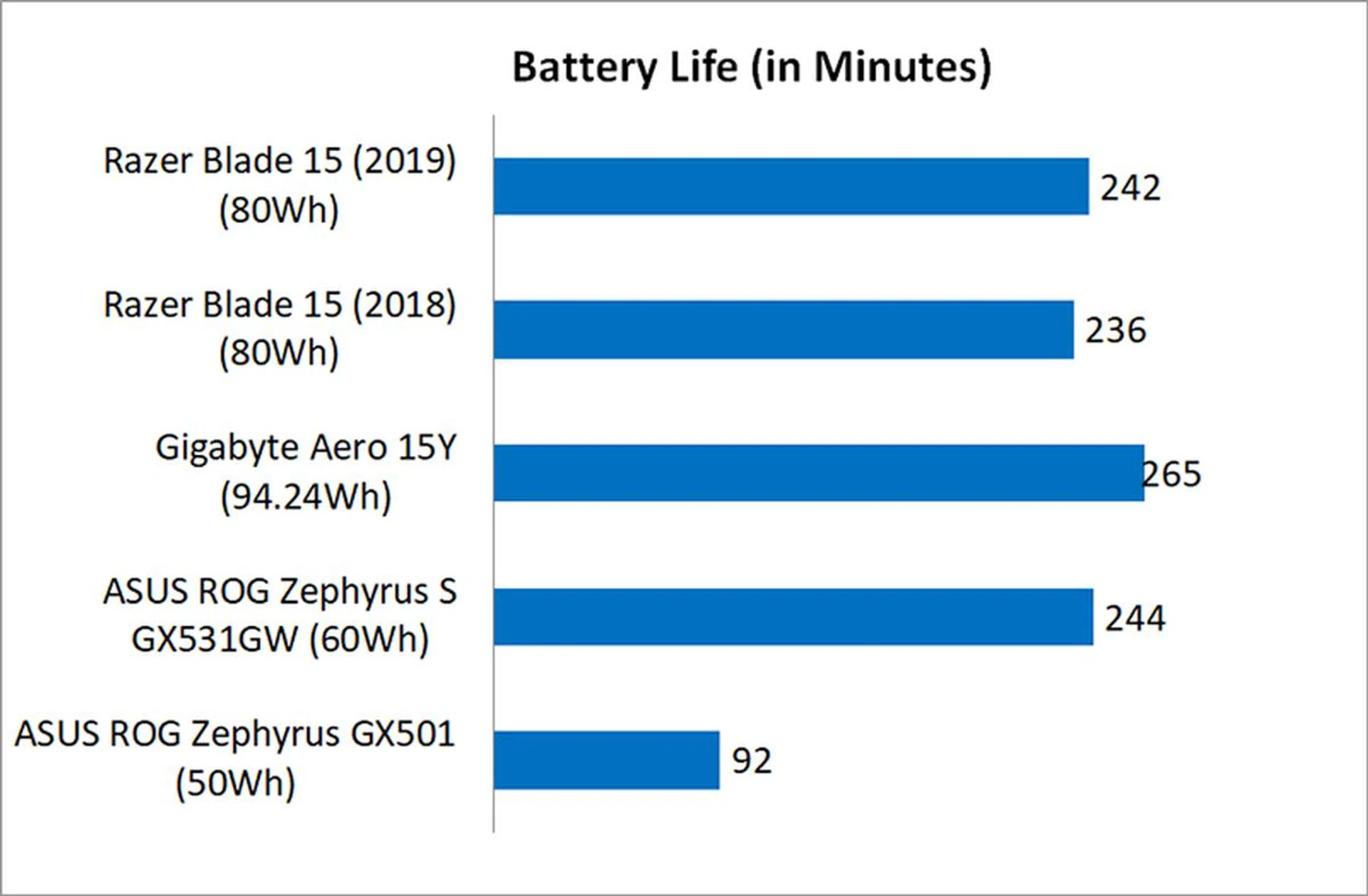 Battery life was one of the strongest points on last year's Blade 15, and that remains the case here as well. The generous 80Wh battery gives the Blade 15 solid battery life for a gaming laptop, even though it still falls behind the Gigabyte Aero 15Y and its even larger 94.24Wh battery. That said, the Blade 15 still comes in near the top of its class, and it's good battery life and slim form factor make it a truly mobile powerhouse.