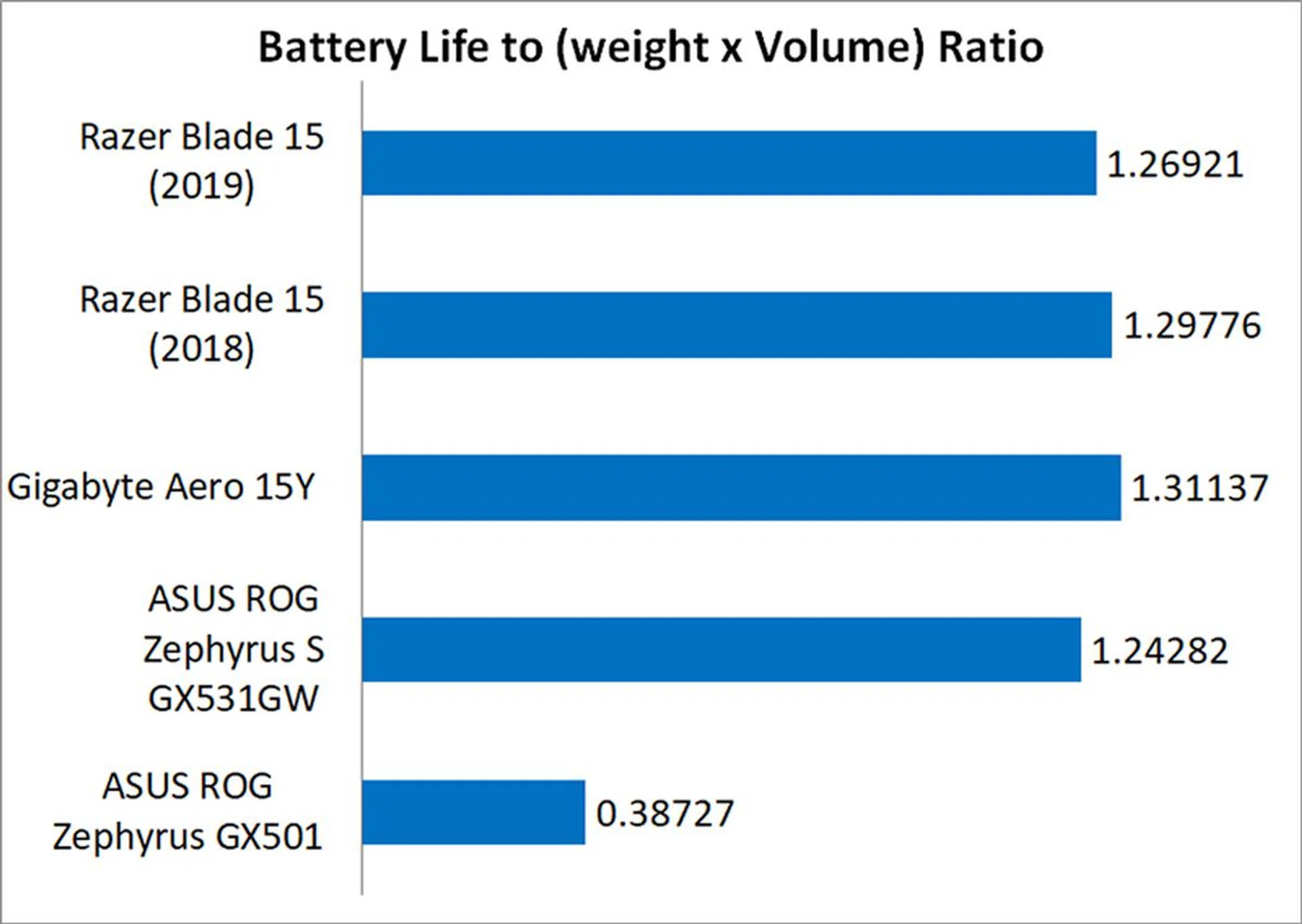 That's borne out in the portability index, which aims to be an objective measure of portability by taking into account factors like weight, dimensions, and battery life. The Blade 15 came in only slightly behind the Gigabyte Aero 15Y, which practically offers the best battery life on any gaming notebook today.