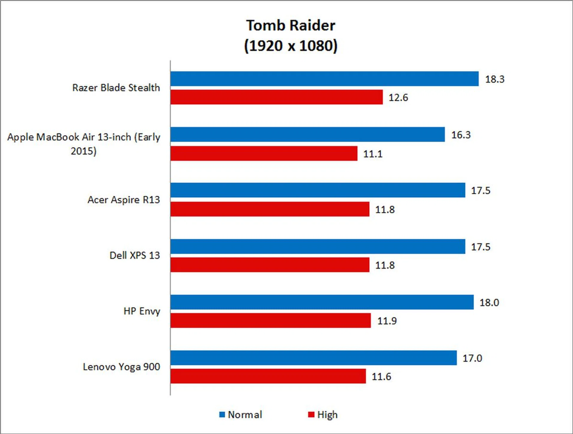 Razer’s ultrabook managed the same in Tomb Raider, where it inched to a small lead over the HP Envy, which had the next best performance. At High settings, it was just over 12% faster than 2015’s Apple MacBook Air, and around 5% quicker than the Dell XPS 13.