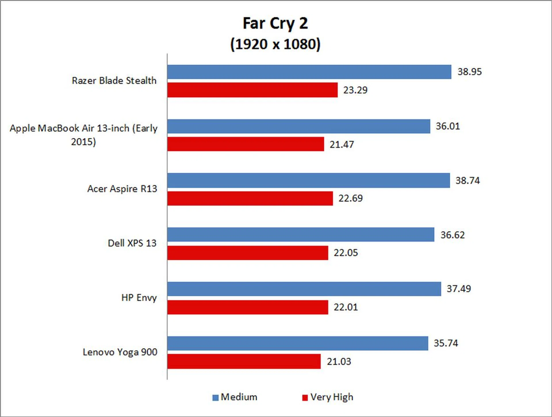 The Razer Blade Stealth managed to edge out the other ultrabooks in Far Cry 2. But as in 3DMark, because most of them share the same iGPU, they all ended up within a few frames of each other. At Medium settings, the Razer ultrabook was around 9 percent faster than the slowest Intel HD Graphics 520 notebook, the Lenovo Yoga 900.