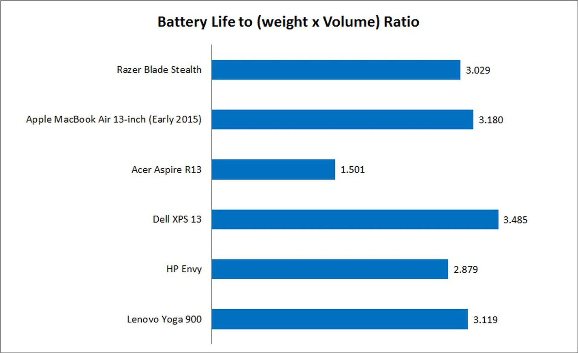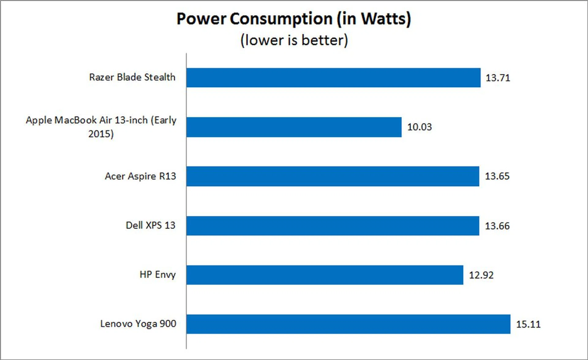 Unsurprisingly, the HP Envy is also slightly more power efficient than the Razer Blade Stealth. However, the Blade Stealth actually only consumes slightly more power than the Acer and Dell notebooks, and it looks like the pair’s larger batteries helped them last longer.