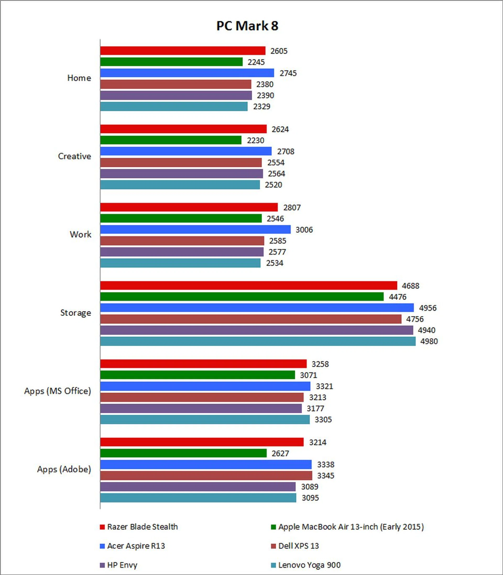 PCMark 8 puts test systems through a variety of workloads in order to provide an objective measure of comparison for performance in real-world applications. The Razer Blade Stealth turned out quite a strong performance in all the benchmarks, and it was the notebook that came closest to rivalling the Acer Aspire R13. It had the largest lead over the other notebooks in the Home and Work benchmarks, which are arguably the lightest benchmarks as they test a system’s ability carry out a variety of basic computational tasks and office workloads.