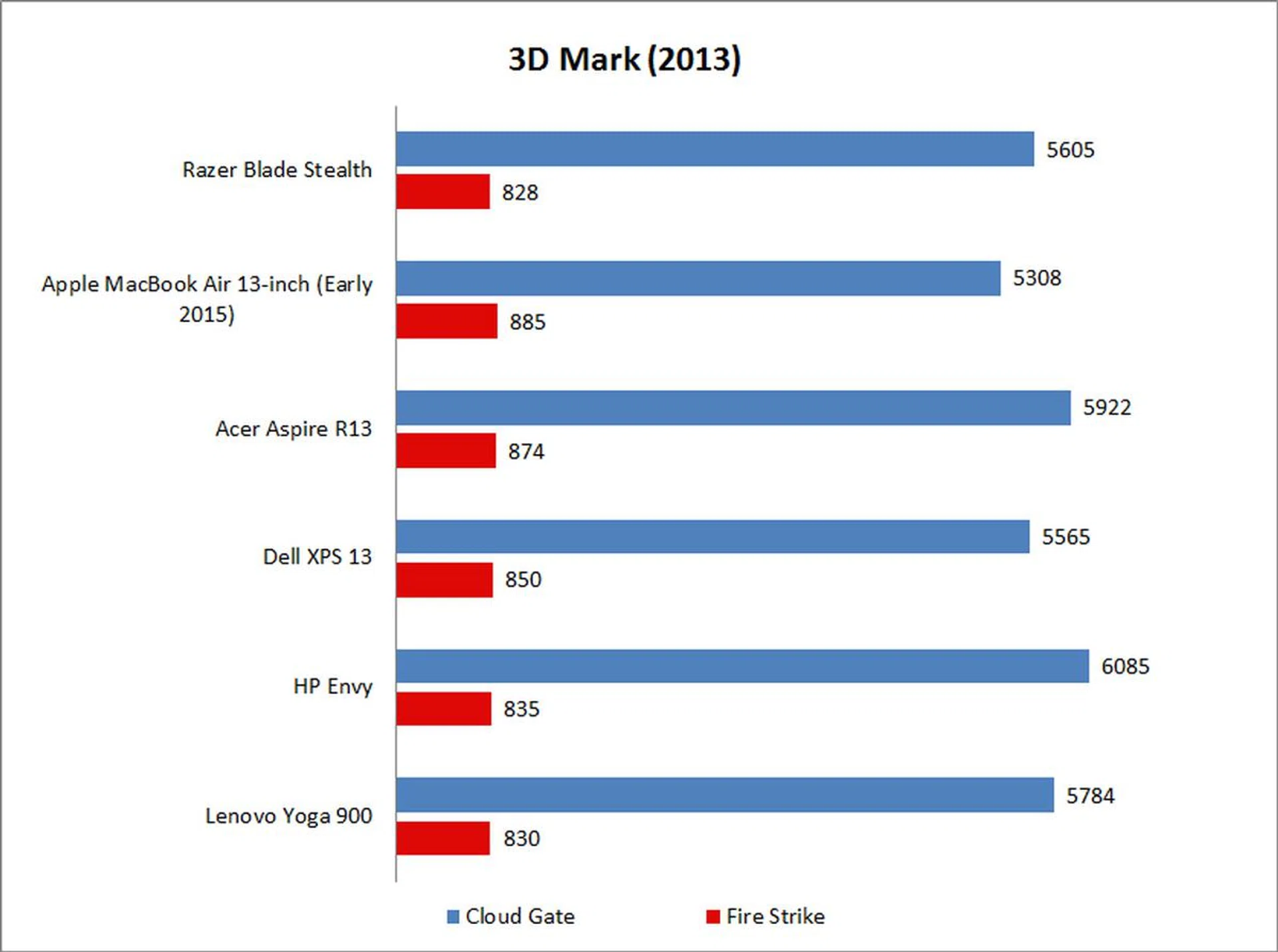 Strangely enough, the Apple MacBook Air’s Intel HD Graphics 6000 outdid everything else in Fire Strike, but that was only by a small margin, and it ended up falling behind in Cloud Gate, where it was around 5 percent slower than the Razer Blade Stealth. All in all, there was little to differentiate the Intel HD Graphics 520-equipped notebooks here.