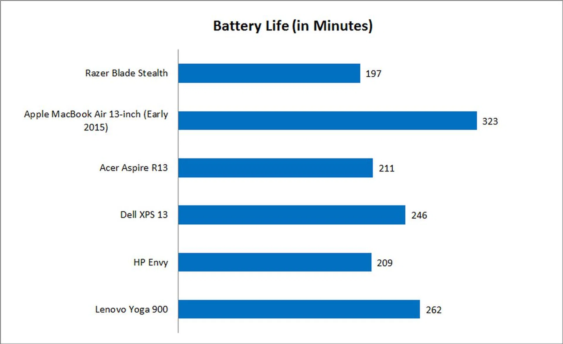 Unfortunately, battery life is one of the Razer Blade Stealth’s weaknesses. In PCMark Home’s built-in battery life test, the Blade Stealth lasted only 197 minutes (with the Chroma keyboard turned off too), behind even the HP Envy, which had a similar-sized 45Wh battery. On the other hand, the MacBook Air continued its class-leading performance with an impressive 323 minutes of battery life, beating out even the Lenovo Yoga 900, which had a larger 66Wh battery versus the Air’s 54Wh pack.