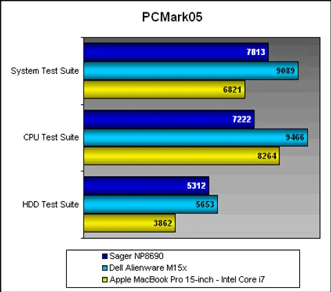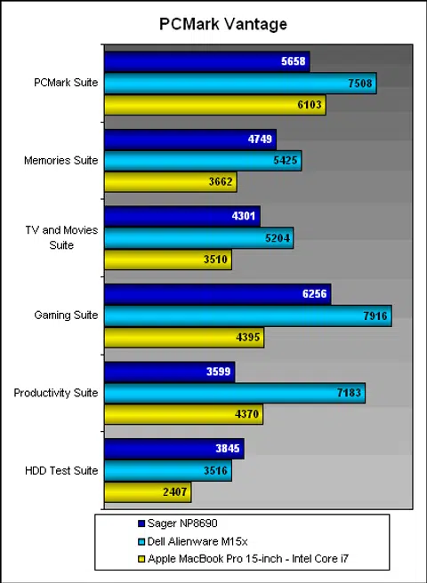 Interestingly, the Intel Core i7 15-inch MacBook Pro does well here, beating the Sager notebook in the overall score but not really doing that strong against the NP8690 in the other dedicated sub-benchmarks. This is due to MacBook Pro scoring better for the Music, Communications and Productivity Test Suites (the former two sets of results aren't reflected here, but are generally represented by the Productivity set of results). If you look at the other scores, the Sager notebook easily comes up tops for the more demanding content creativity suites where the notebook flexes its raw processing performance. Despite Sager's good showing, the Alienware unit still retains the crown almost across the board. The one place Sager did get ahead of the Dell Alienware M15x is is the HDD test suite where the 7200rpm drive on the Sager notebook made its mark.