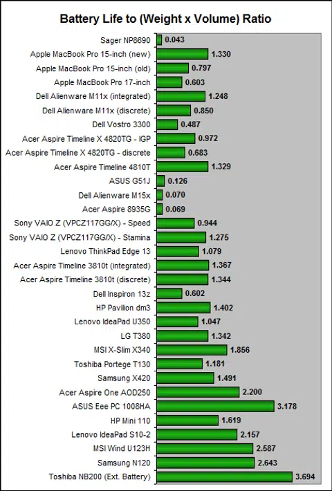 As for our Portability Index, it's a measurement where we consider the battery uptime of the notebook and divide it by the product of the unit's weight and volume. The higher the ratio, the more portable the unit is. The Sager notebook obviously scores much much lower than most of the other notebooks in this comparison. It's so low, we don't really expect anyone to be using this without a power point and its accompanying chunky heavy power adapter too. In a way, it lives up to its DTR moniker in the strictest sense.