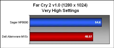In a real world gaming performance, we loaded up the notebook with Far Cry 2 and tested the unit with the Far Cry 2 benchmark program at Very High settings. Two resolutions were used: 1920 x 1080 and the more common 1280 x 1024 and found that even at the highest settings, the notebook was able to deliver decent frame rates compared to other notebooks using less powerful discrete graphics engines. Most importantly, it also beat the M15x with much better frame rates at both our tested resolutions.