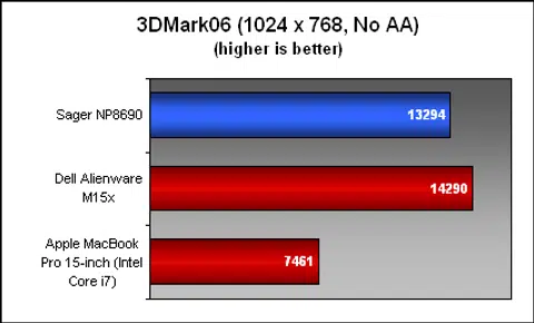 Now, here comes the interesting part. The Sager uses one of the most powerful mobile discrete graphics chips at the moment, so we were expecting extremely high performance but we were a tad disappointed. The notebook certainly raised eyebrows with its 13294 3DMark06 score and only the Dell Alienware M15x remained defiant, beating the Sager notebook by just 1000 points. One reason why the GeForce GTX 260M equipped Dell notebook still managed to get an upper hand is because 3DMark06 also factors in CPU performance and as such, the much more speedier Extreme-class Intel processor on the Alienware machine pulled ahead.