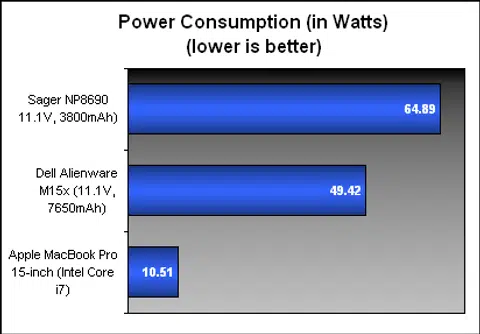 Lasting a jaw-dropping short time of just 39 minutes, the Sager NP8690 most likely breaks our records for a notebook with the lousiest battery life. To be sure, we even ran this test a few times just to be sure and results were similar. This also means the power consumption of the unit should be pretty high and our calculations show it to be so, with the unit consuming a whopping 64.89W. It also doesn't help that the battery capacity is so low, as other DTRs packed a much more powerful battery that let them last much longer. Perhaps the limited power battery pack was designed on purpose since most people won't be lugging a notebook around this heavy and chunky anyway.
