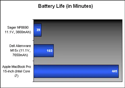 The Sager NP8690 is one heck of a monster notebook, and given our experience with previous desktop replacement class of notebooks, we don't expect it to last very long. Given that it's using a 3-cell battery that's only rated at 11.1V and 3800mAh, that's a very limited battery pack for a notebook using such power hungry hardware. Let's see how it holds up in our DVD battery life test, which involves looping a DVD movie at 50% screen brightness and volume with WiFi turned off. It should give us a good indication on whether this notebook is one you can carry around, or whether it will be permanently stuck at your table near a power point.