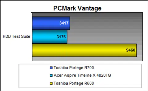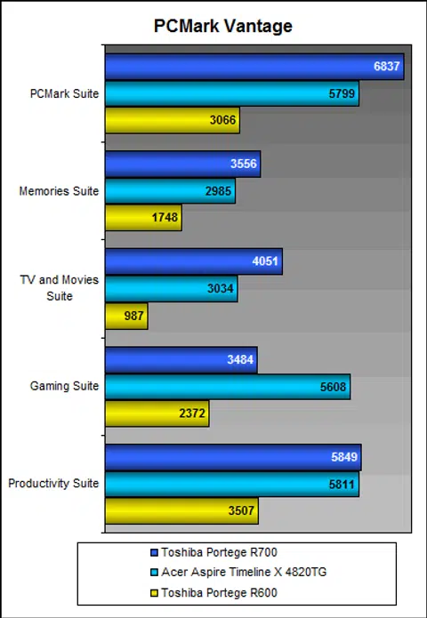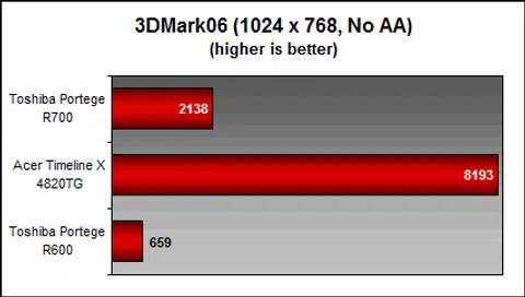 Here's where the Acer Timeline X with its discrete graphics option does better than the Toshiba Portege R700. The scores speak for themselves, but bear in mind that the R700 is made for the corporate boardroom, so don’t expect to be gaming on this machine.