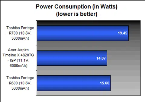 While the Toshiba Portege R700 may boast of a newer and faster processor compared to the R600, the new processor is also pretty power efficient, based on our findings of similarly equipped machines. And as the chart shows, with a battery length of 193 minutes and a power consumption of just 19.45 watts in our DVD benchmark test, the notebook seems pretty well equipped to function without a power point, though it could be better.
