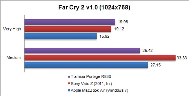 For this real life gaming test, we used the benchmark capabilities of Far Cry 2. We don’t recommend that you get the Toshiba Portege R830 for gaming purposes (it's not branded as a gaming notebook for a reason), and you can easily see why via the Far Cry 2 scores. The Portege R830 features only the integrated graphics solution (Intel HD 3000) that isn’t exactly built to run high-end games. If you really need to play PC games (we don’t want to know why) on a business machine such as the R830, the integrated graphics are powerful enough to allow you to do so with settings set at the bare minimum. And even then, it might not be a very good idea.