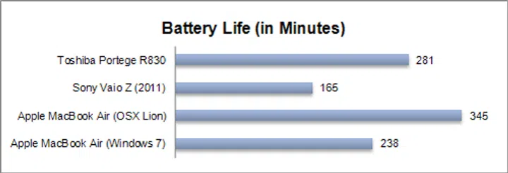 Our battery life tests consists of playing a DVD loop, with the screen and volume turned down to 50%. We’ve taken scores from the MacBook Air, running on both Windows and OS X Lion, to showcase just how great the Toshiba Portege R830’s battery life is. The Sony Vaio Z is there to show you that even though it is extremely thin, light, and portable, it might not necessarily translate into better battery life. The Portege R830 stayed alive for as long as 281 minutes, that’s just 19 minutes shy of 5 hours (4 hours and 41 minutes, to be exact). Now that is a long time, in the world of Windows notebooks. Even the super portable MacBook Air running on Windows 7 only managed 240 minutes. With that kind of battery life, we imagine that’s plenty of work you can finish unplugged, and out of the office.