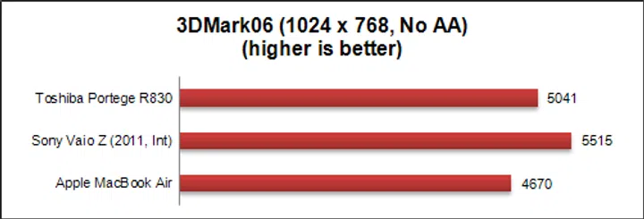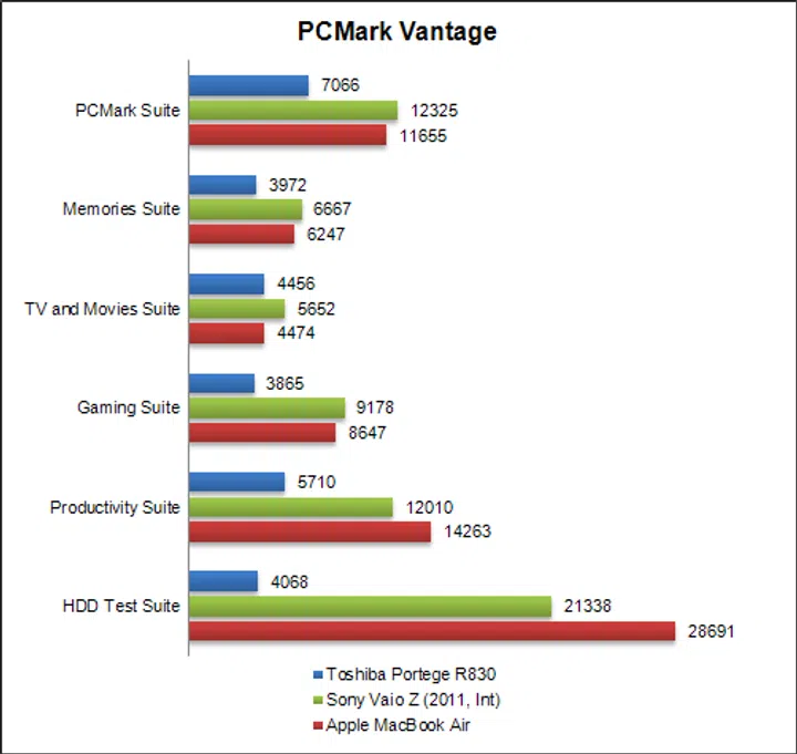 The PCMark Vantage test gives us a gauge on how the machine being tested responds to various tasks that utilize what the machine packs. Before we start analyzing the scores, we’d like to remind you that the Portege R830 is strictly built for business. What it can do outside of a business environment, we’d see it as a nice little bonus. As you can see from the chart, the Portege R830 trails behind the Sony Vaio Z, as well as the Apple Macbook Air. The main factor here, is that the Portege is not running an SSD - which enhances read and write speeds exponentially - like the other two machines.