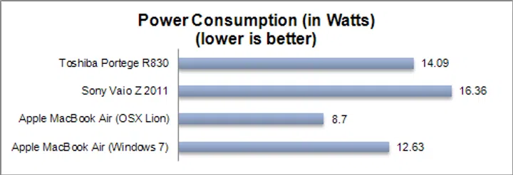 What it does have however, is something which should be seen more often in notebooks these days. And that's long battery life. In fact, quasi-Ultrabooks (only because of its cost) like the Samsung Series 9 don't have the power consumption, or battery-life numbers that are better than the Toshiba Portege R830. Even the superb MacBook Air has a battery life of 238 minutes (on Windows 7 via Boot Camp), which is about 40 minutes less than the Portege R830. As such, no one can touch the R830 in terms of battery life while on Windows.