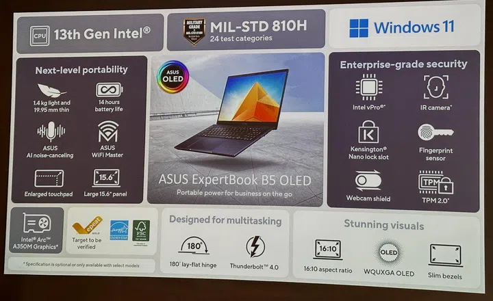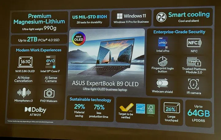 Speaking of ExpertBooks, ASUS has updated its line of business notebooks as well, the highlights being the ExpertBook B9 OLED and ExpertBook B5 OLED, the world's lightest 14-inch and 16-inch business laptops, respectively. The B9 OLED features a 2.8K resolution 14-inch OLED display, weighs just 990g, and has a slim 15.78mm profile. The ExpertBook B9 OLED is also the world's first magnesium-lithium laptop to employ Thixomolding technology, reducing waste by up to 29% and shortening manufacturing time by up to 75%. This laptop is made with up to 70% post-industrial recycled metal and is Energy Star certified, exceeding energy-efficiency standards by 44%. While we've always enjoyed the ExpertBook series like in our last review, the new B9 OLED edition looks to make it even more disireable.