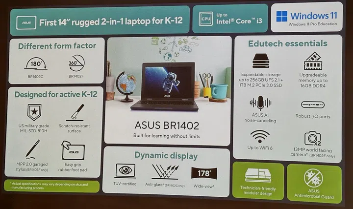 In addition to its business offerings, ASUS presents upgraded and portable education solutions with large displays and long-lasting battery capacity. This is because their existing solution is a 11-inch notebook form factor. The new ASUS BR14 series with a 14-inch screen is designed with a ruggedized form factor as well, which meets the durability requirements of educators and active students. These solutions feature sustainable design elements and an easy-to-service, modular design, enabling schools to be cost-efficient and better manage maintenance.