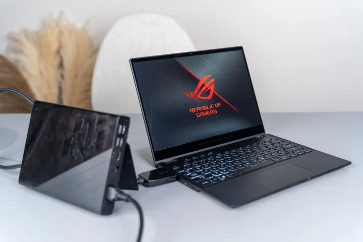 But what really sets the ROG Flow X13 apart is its ability to dock with an external GPU dock, the ROG XG Mobile. It is a fraction of the size of external graphics but packs up to an NVIDIA GeForce RTX 3080 GPU that directly connects to the notebook via a custom interface faster than Thunderbolt 4. A dedicated USB 3.2 Gen 2 link feeds an I/O hub with extra connectivity, while an integrated 280W AC adapter powers both the Flow X13 and XG Mobile.