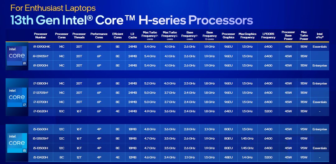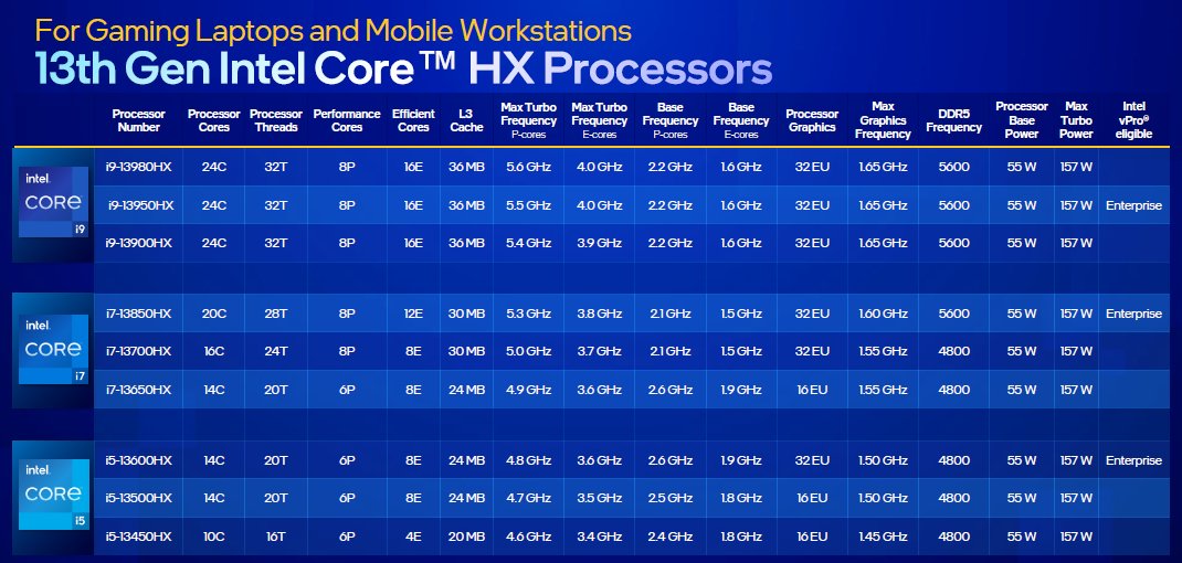 Intel has just unveiled its 13th generation Intel Core mobile processors at CES 2023 based on the Rapor Lake processor architecture. This includes the new flagship Intel Core i9-13980HX, the first true 24-core processor for laptops. This easily supersedes the previous best 12th Gen Core HX processor, the 16-core Core i9-12950HX. The new HX-series processors offer a turbo frequency of up to 5.6GHz, the highest clock speed available for laptops, and are aimed at serious gamers and creators looking for a true mobile workstation equivalent powerhouse. These record-breaking figures all add to the processor's big uplift over a similar generation from last year. A total of 9 variants of the HX class processors are available from Core i5 to Core i9 tiers, all with the same rated TDP of 55W (but can be boosted to 157W via Intel Turbo Boost). There are even vPro compatible editions in each tier.