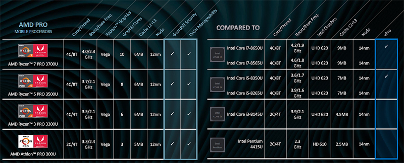 From the red camp, AMD has the new Ryzen Pro 3000-series that comprises the Ryzen 7 Pro 3700U, Ryzen 5 Pro 3500U, and the Ryzen 3 Pro 3300U processors. There’s also the Athlon Pro 300U CPU. The key difference of these 2nd generation Ryzen Pro / Athlon Pro processors over the first generation is the built-in Radeon Vega graphics engine - great for accelerating light graphics workloads and where graphics compute acceleration come into play that is usually the domain of discrete graphics.