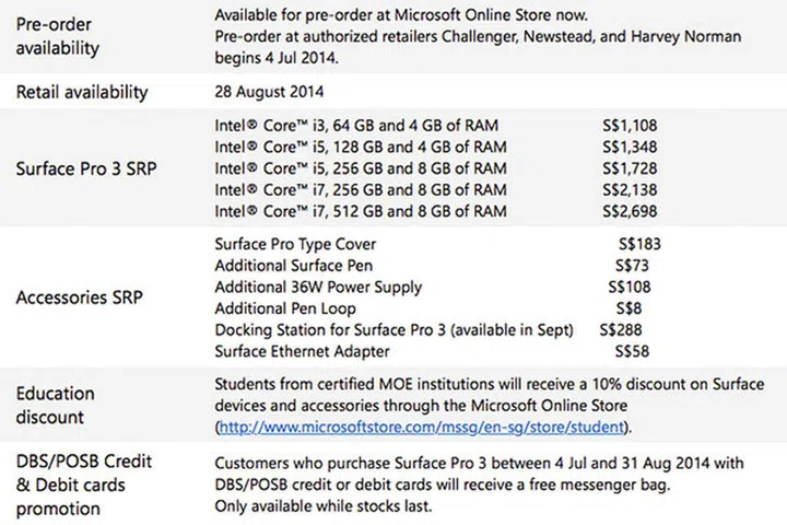 Here’s a recap of the Surface Pro 3 availability, pricing, and promotions, courtesy of Microsoft Singapore:
