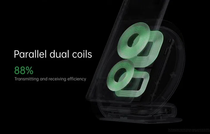 For its 65W wireless charging (65W AirVOOC), Oppo claimed that it could fully charge 4,000mAh devices in 30 minutes, and it's not that much different from its previous 65W wired charging in terms of time spent. This was made possible with the use of parallel dual coils (40W coil and 25W coil in parallel connection) with 88% transmission and receiving efficiency.