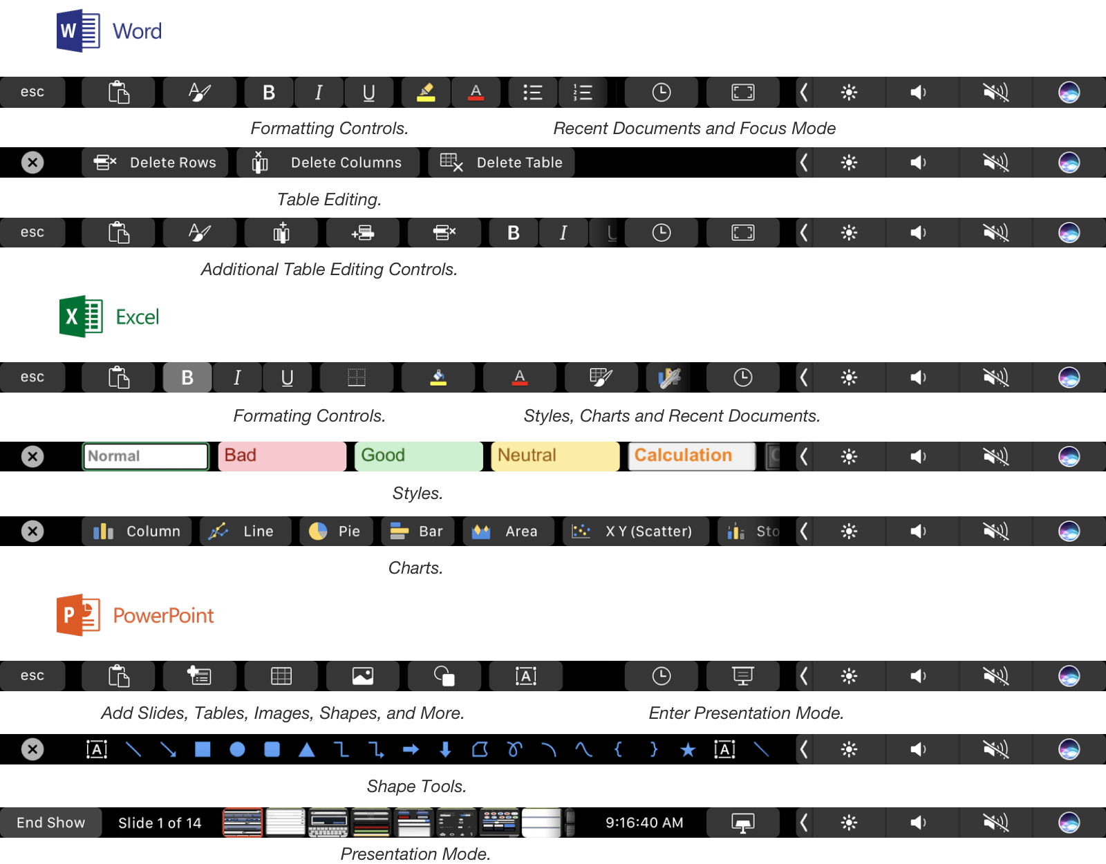In a nutshell, depending on the document you’re working on, Office will intelligently put the most common commands on the Touch Bar. So you’ve formatting and table editing controls in Word; style controls and recommended charts in Excel; and shape tools in PowerPoint - just to name a few.