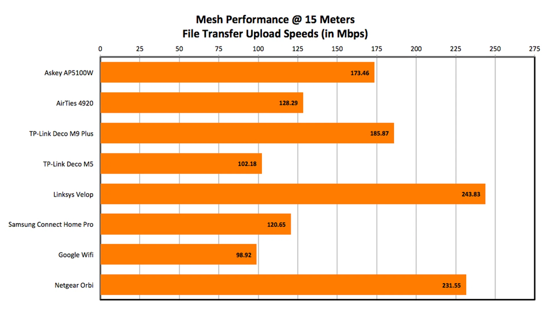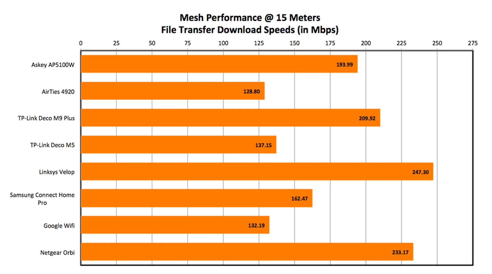 Mesh performance at 15 meters was very respectable. The Linksys Velop and Netgear Orbi were the clear leaders here but the Askey AP5100W was not that far behind. More importantly, it recorded significantly better performance than the AirTies 4920.
