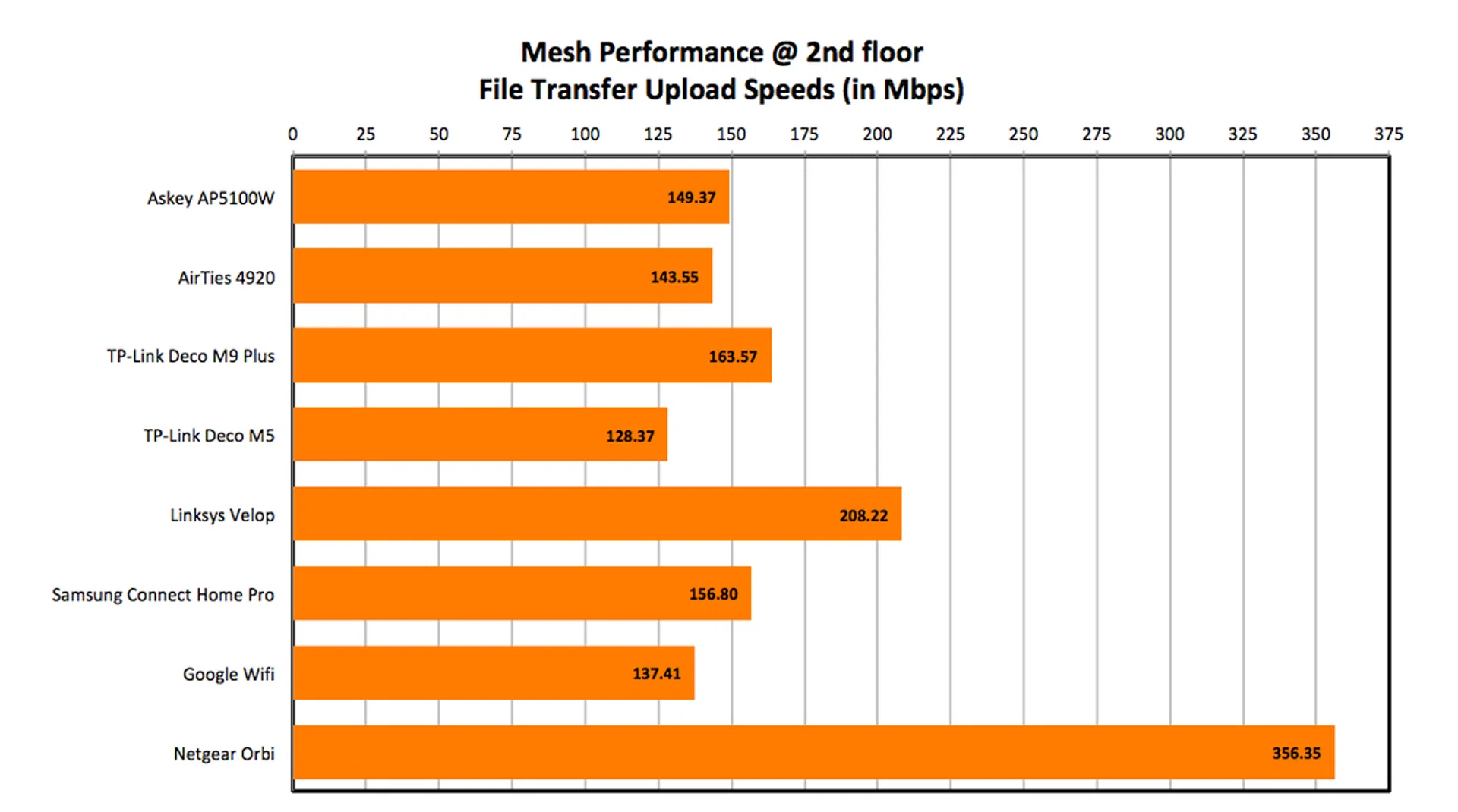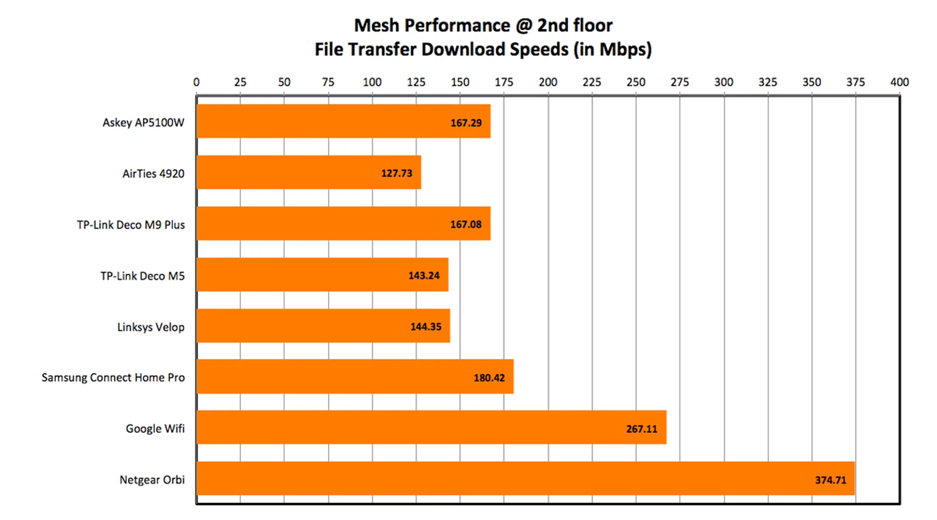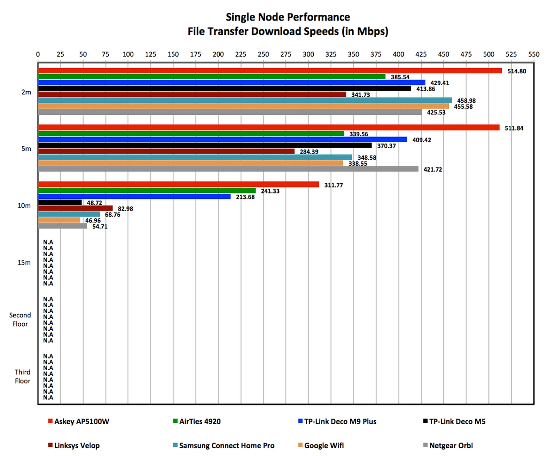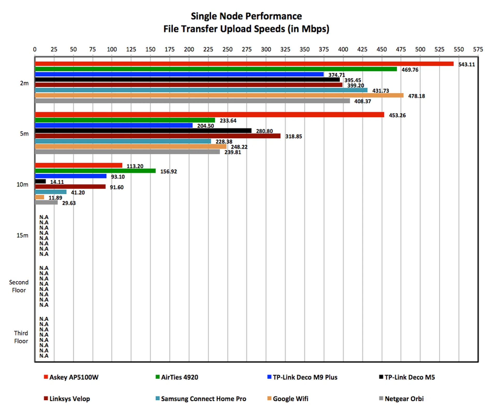 To further clarify, in tests where nodes were placed on the second or third floor, the measurement would be taken with the client device about two meters away from the node. Finally, included in the graphs are results of other mesh networking systems including the AirTies 4920, TP-Link Deco M9 and M5, Samsung Connect Home Pro, Google Wifi, Linksys Velop, and Netgear Orbi.