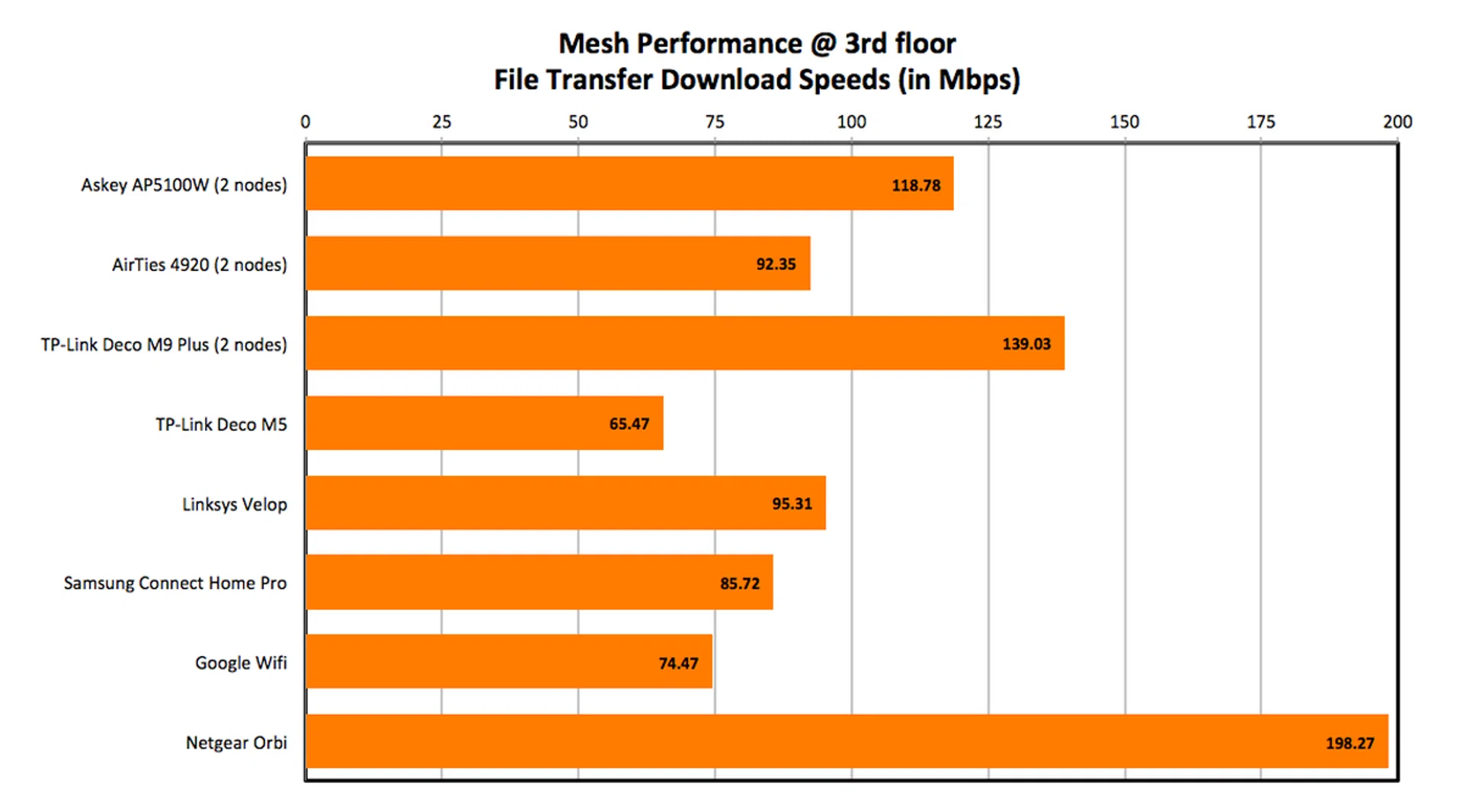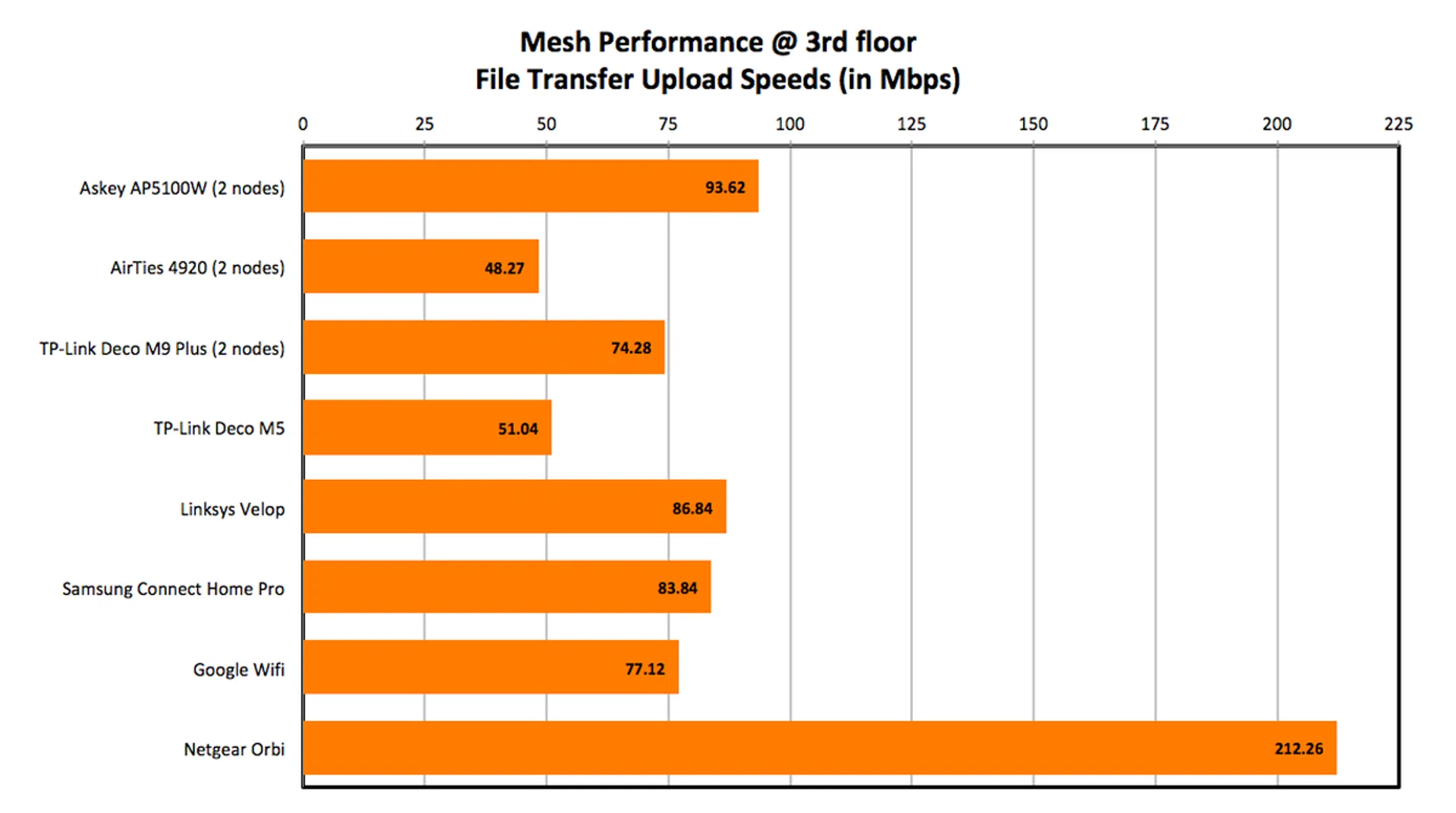 With a node on the second floor to bridge the distance between our client device and the main router on the first floor, we got pretty decent results. The Netgear Orbi was the runaway leader, but the Askey AP5100W put up numbers that were comparable to other mesh networking systems like the TP-Link Deco M9 and Samsung Connect Home Pro.