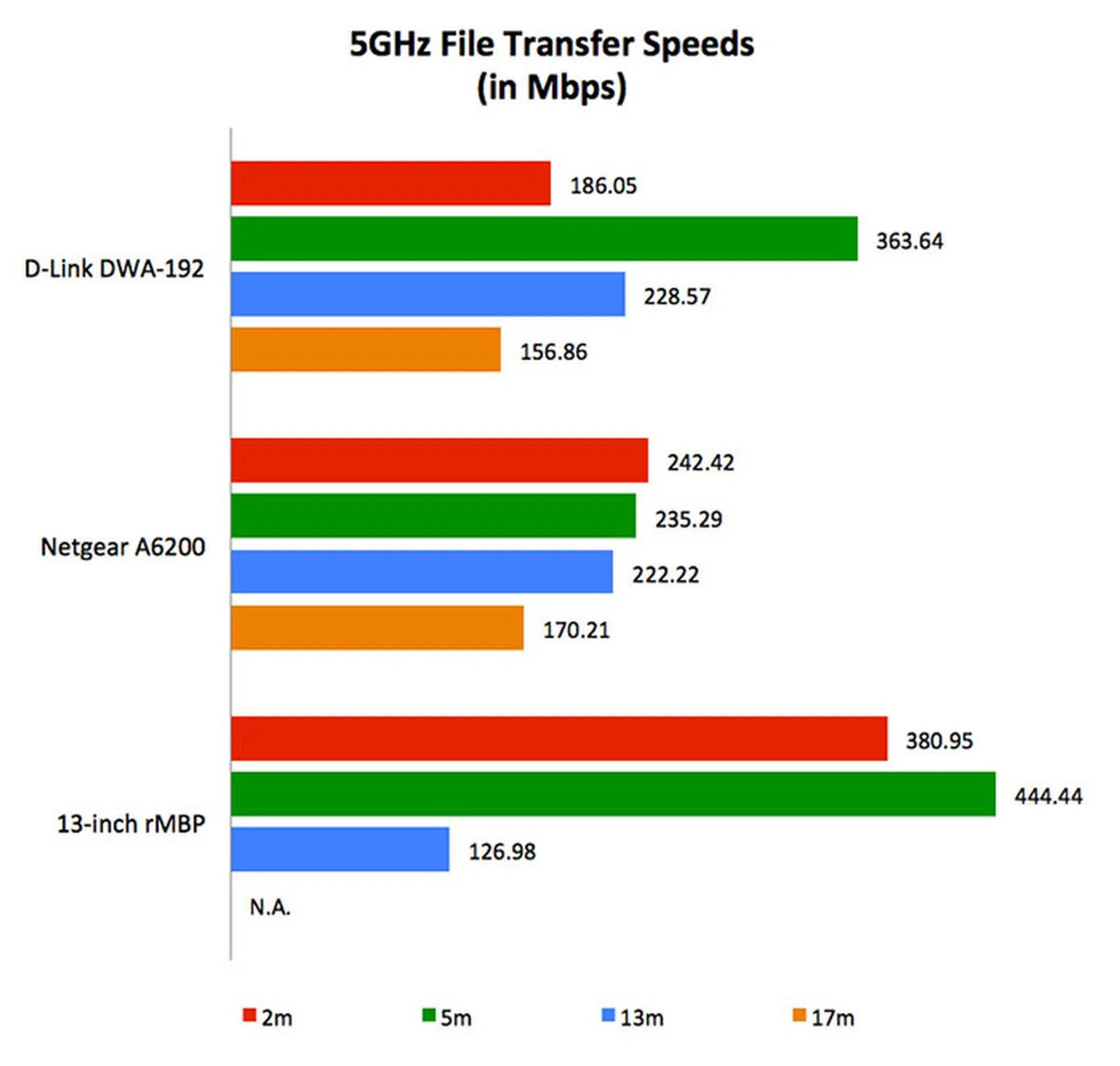 Based on the results above, the D-Link DWA-192 wireless USB adapter does have the potential to provide extra performance over your more typical AC1200 wireless USB adapters. However, the test results suggest that it works best a medium range. At 5 meters, it was significantly quicker than the Netgear A6200, to the tune of around 54%. And while the D-Link DWA-192’s close range performance is no match for the MacBook Pro, its performance at the farther 13 and 17 meters was still somewhat decent.