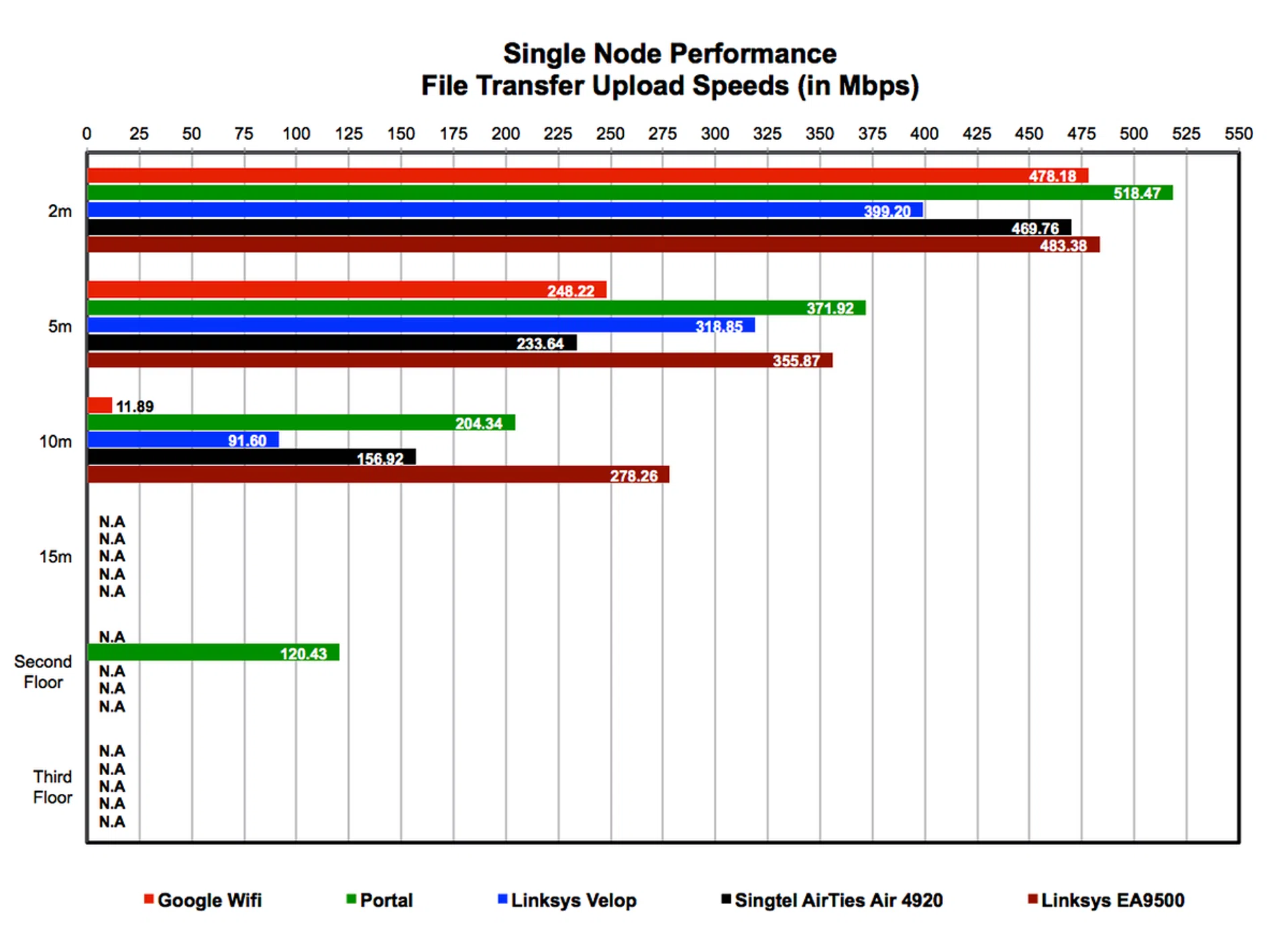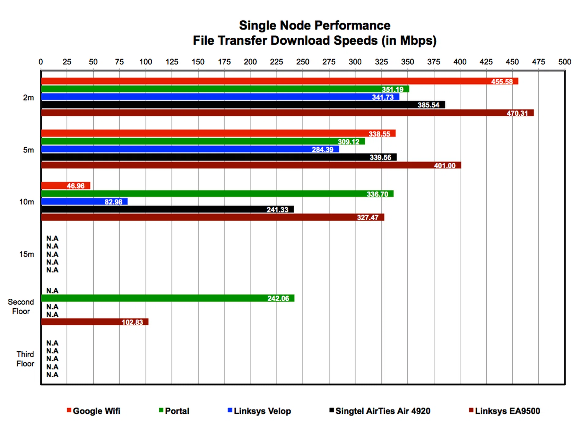In this test, we will be looking at the performance of a single Google Wifi node in a single-story (using the differnt distance markers) and multi-story home. All other competitive mesh networking system results are also that of a single node setup.
