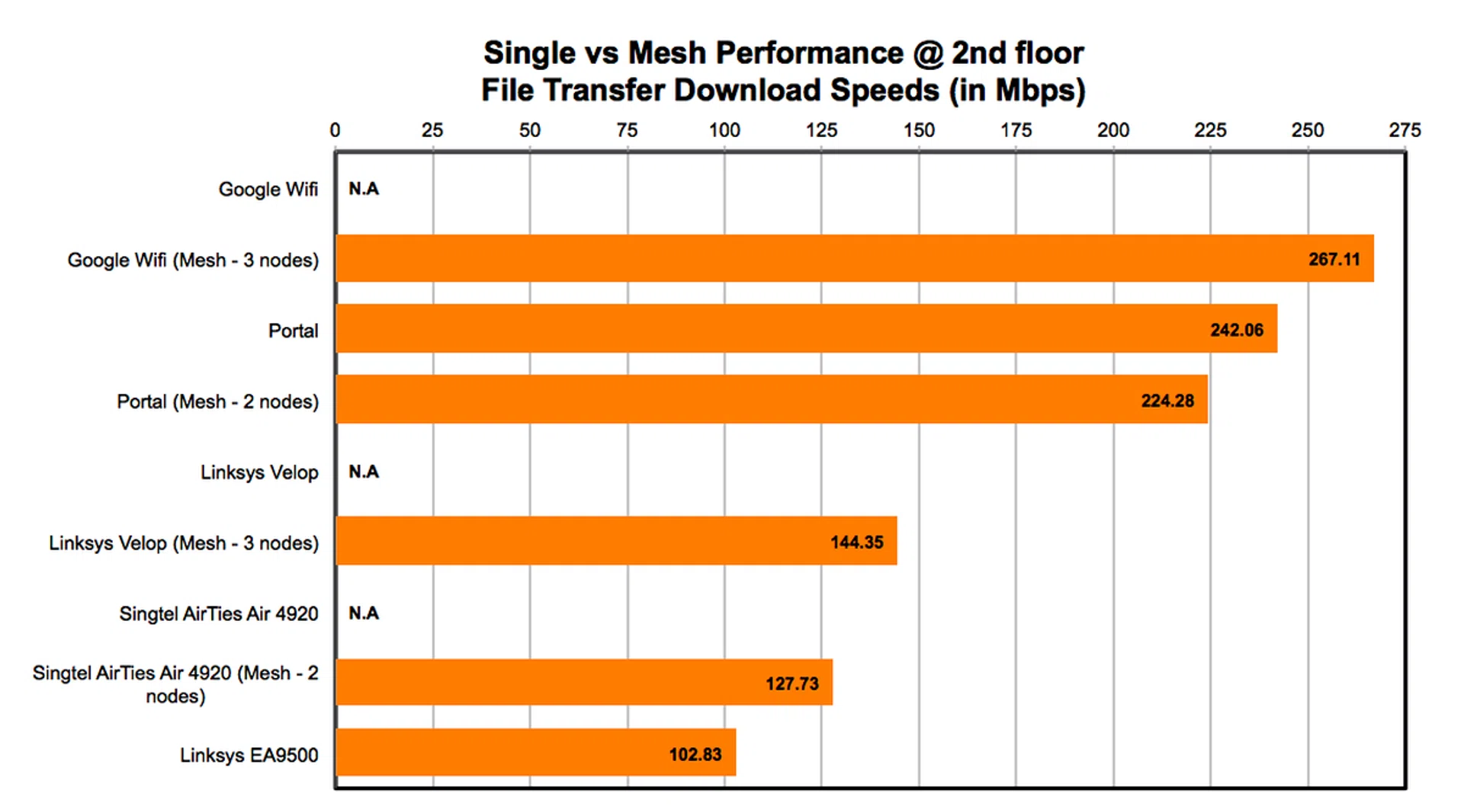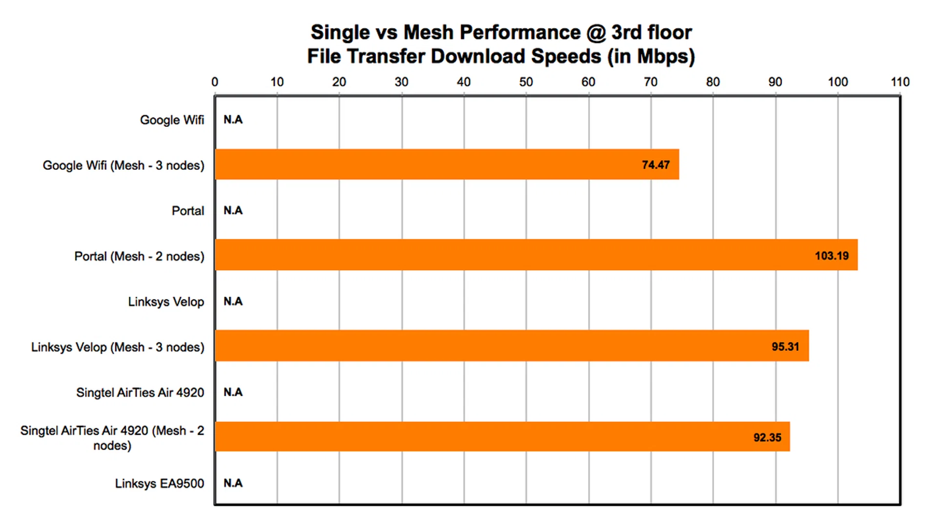 In this test, we placed a third Google Wifi node on the third floor to expand coverage to three floors. We did the same for other mesh networks to see how their performance would compare. However, do note that the Portal and Single AirTies setups only consist of two nodes, with one node on the first floor and the second node on the second floor.