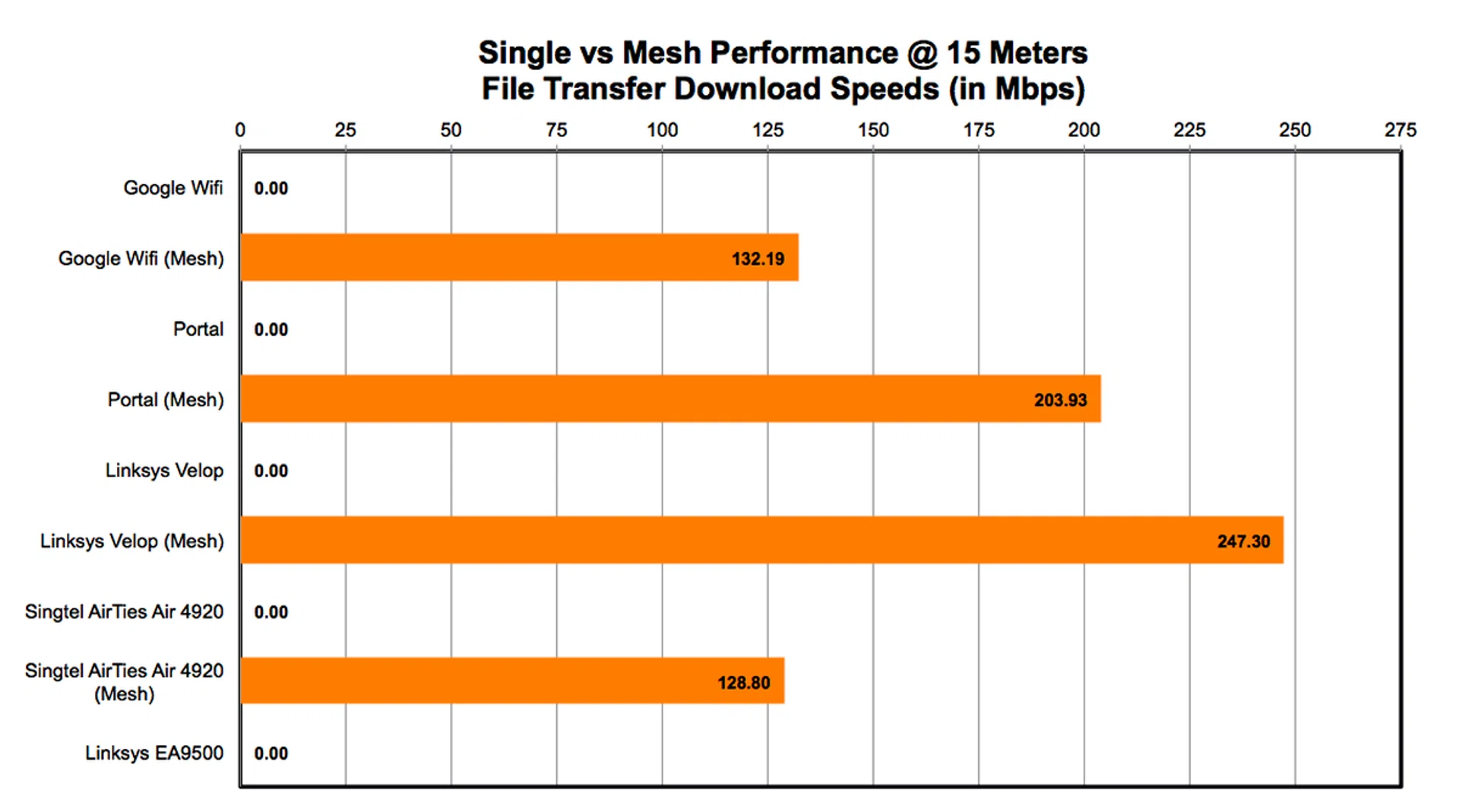In this test, we placed a second Google Wifi node in between the first node and the 15-meter mark to create a mesh network to get signal to the problematic 15-meter mark. We did the same for other mesh networks to see how their performance would compare.